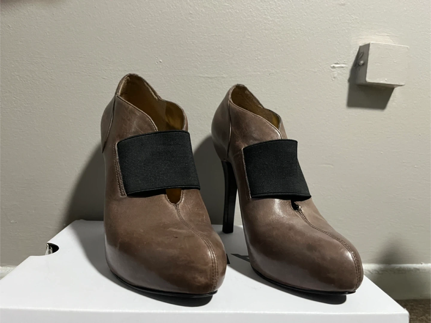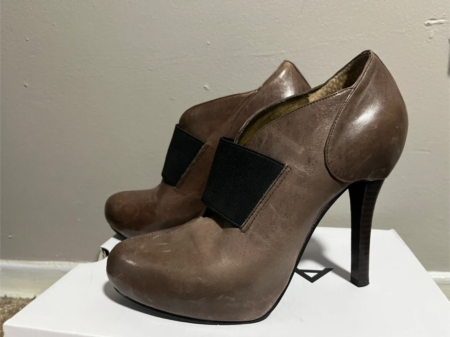 Selling a pair of Nine West heels in a lovely brown leather! They are a size 7 and feature a unique design with a black elastic strap. Perfect for dressing up or adding a touch of sophistication to your outfit