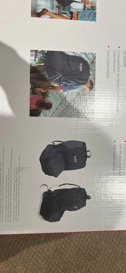 Britax car seat travel bag. Used for 2 trips. No rips or stains. Black with red stitching. Great for protecting car seats when you travel. Has handles for easy carrying. Comes in the original box.