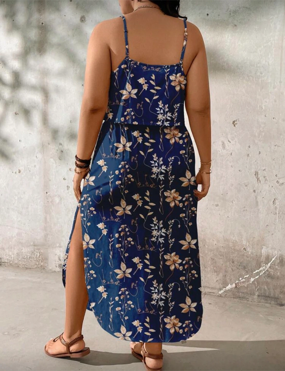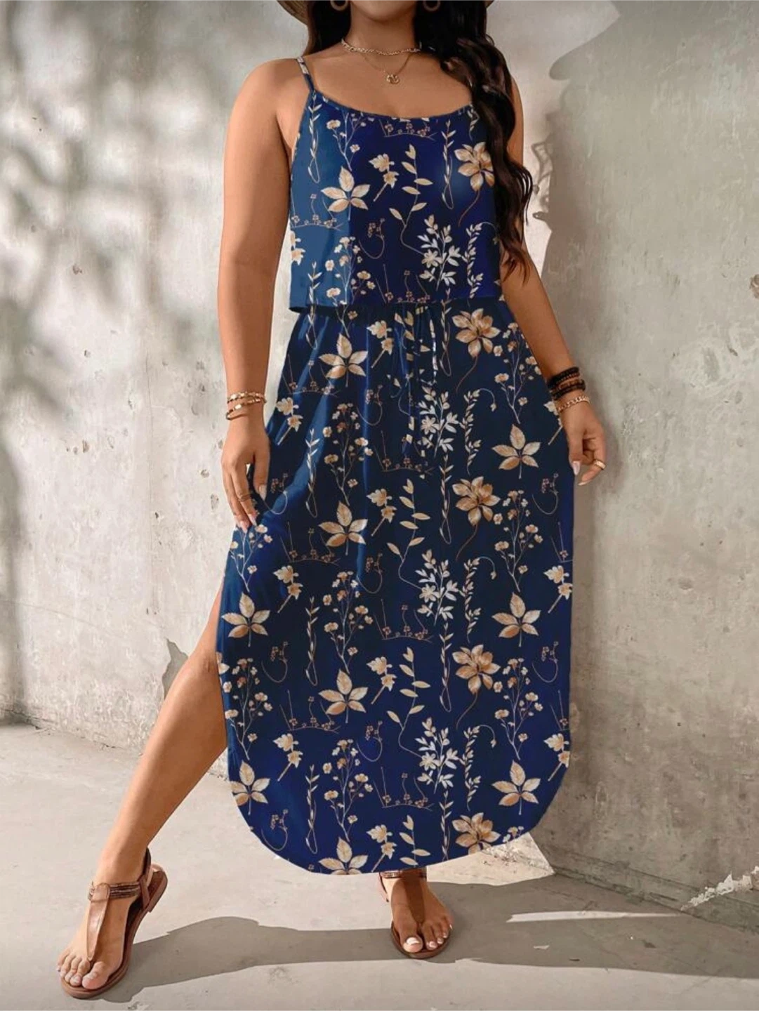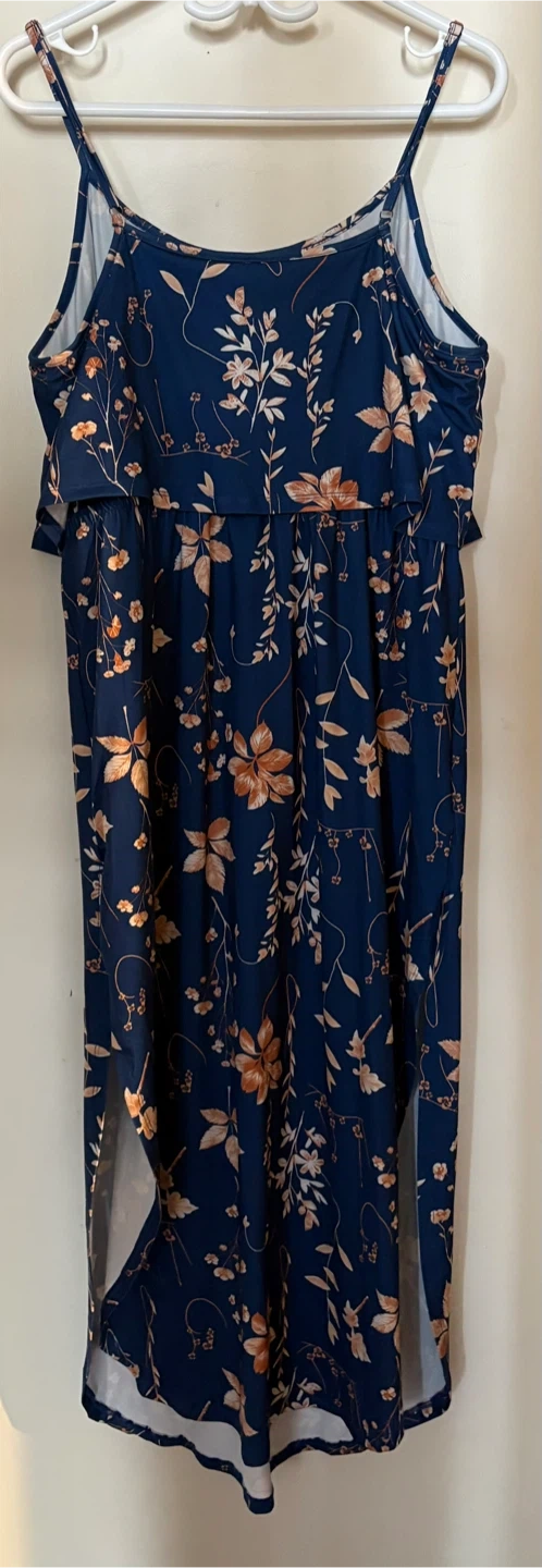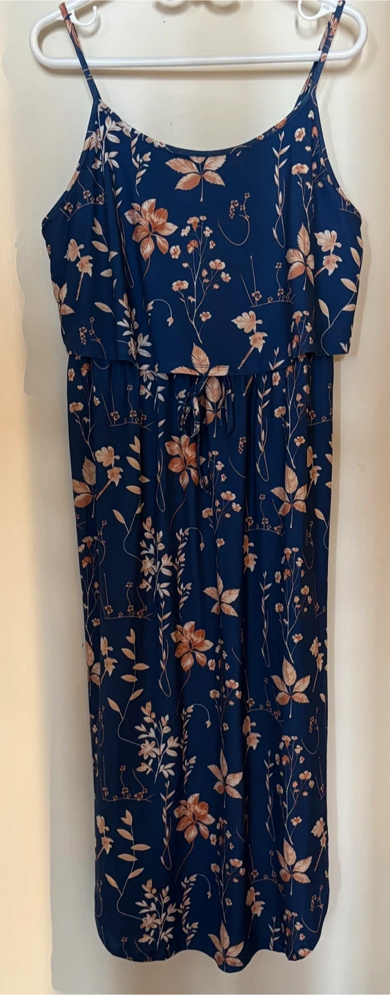 A lovely navy blue maxi dress featuring a white and beige floral print. It has adjustable spaghetti straps and side slits for a comfortable fit. The empire waist is cinched with a drawstring.