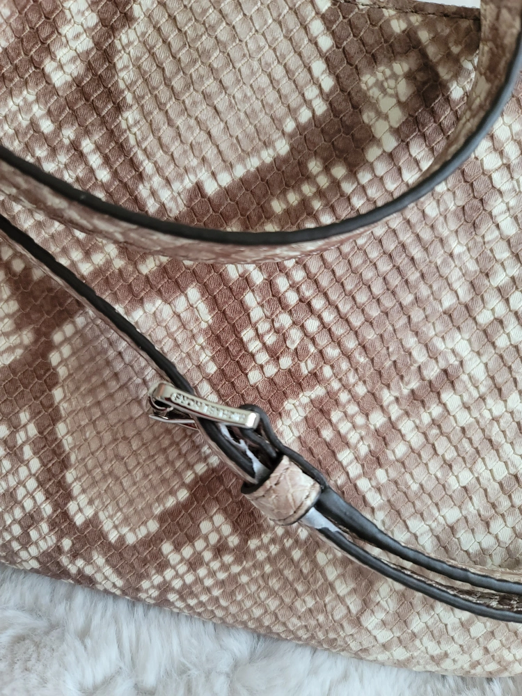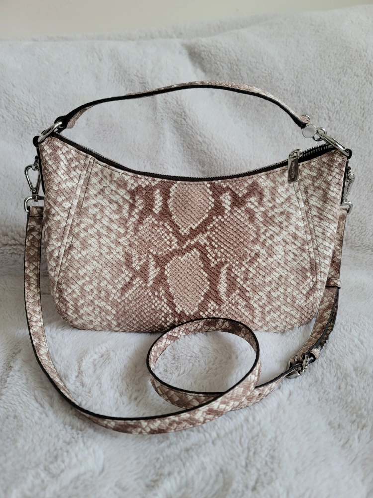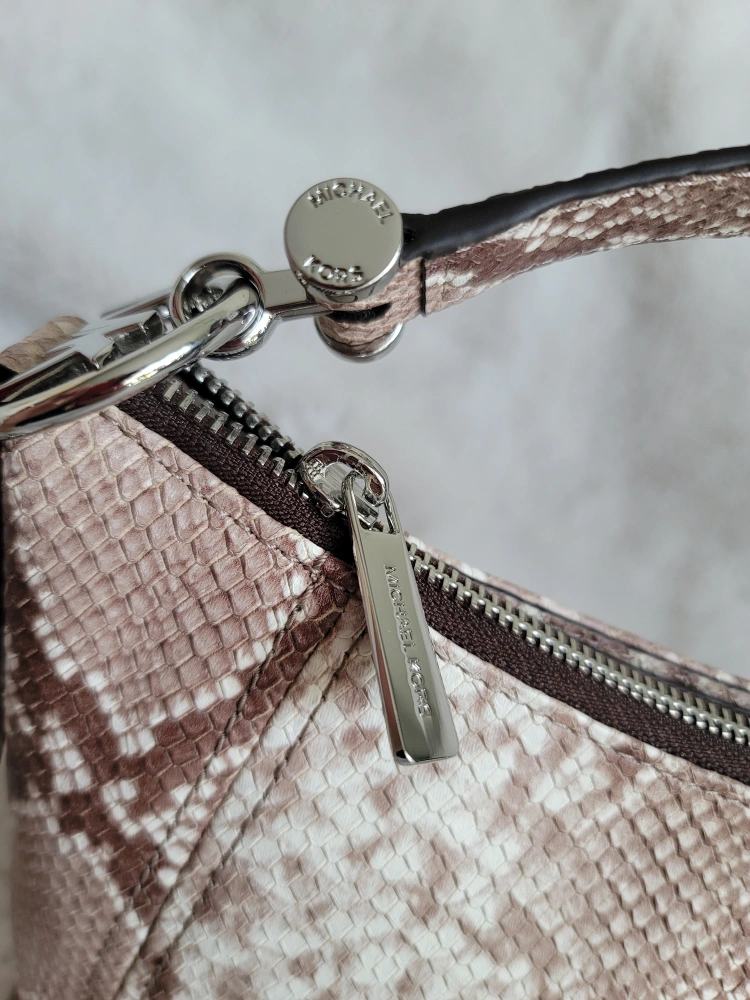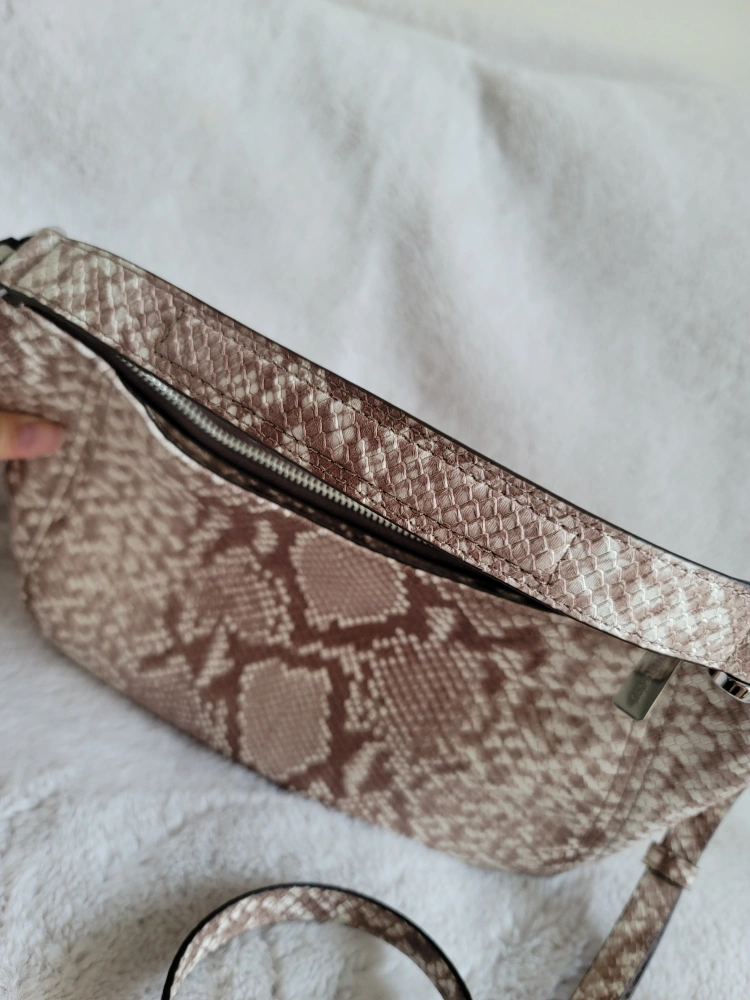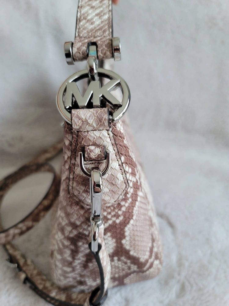 This is such a fun neutral animal print snakeskin print bag by Michael Kors! This is in excellent like new condition! No dustbag. Pickup at & 401, Scarborough Comes with the top handle attached, and a removable crossbody strap. This is a great small to medium size bag, perfect for everyday and the 2 types of straps are so convenient for grabbing and going plus crossbody for hands free. Features shiny silver hardware Zipper top opening Concealed exterior slip pocket with magnetic closure. Tan fabric lining inside Slip and zipper pocket inside.