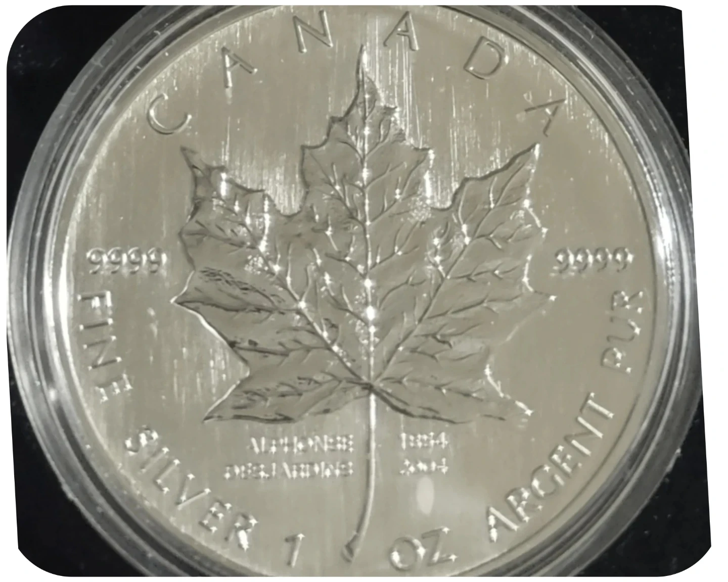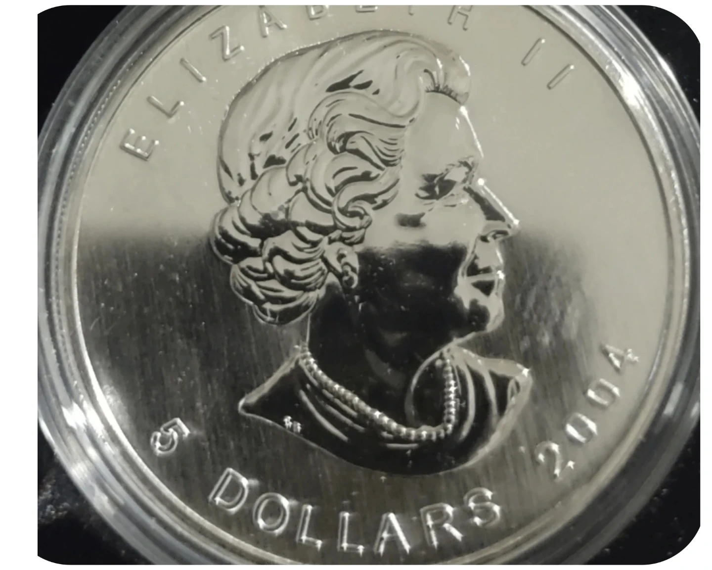 A 2004 1 oz Fine Silver Maple Leaf coin from Canada. Struck with 99.99% pure silver. Features Queen Elizabeth II on one side and the iconic maple leaf on the other. Comes in a protective case with its original Desjardins 150th Anniversary box.