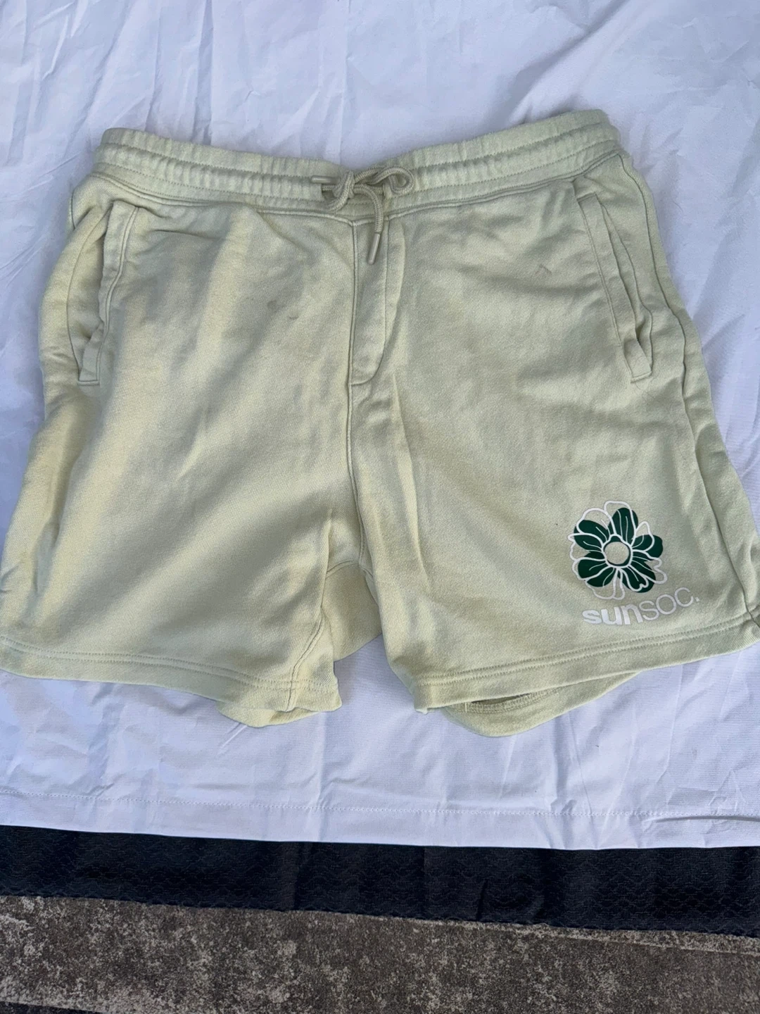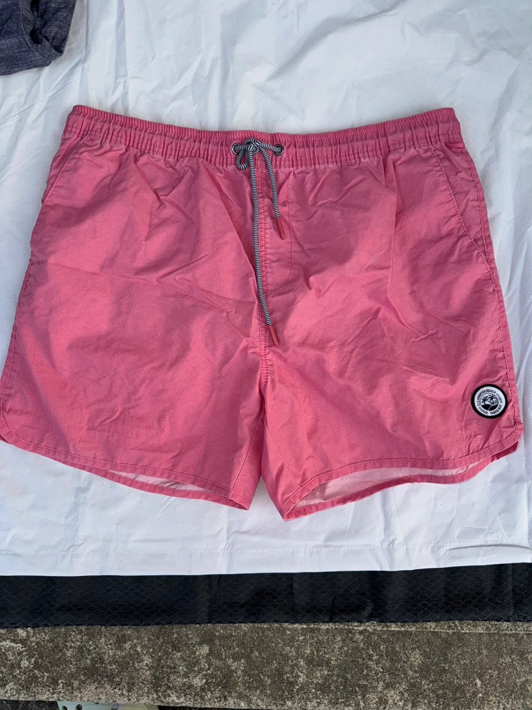 Selling a variety of men's shorts in different styles and sizes. There's a pink pair of swim shorts, a blue ombre pair of swim shorts, a distressed gray denim pair of shorts, a blue pair of casual shorts, and a green pair of casual shorts. All in good condition!