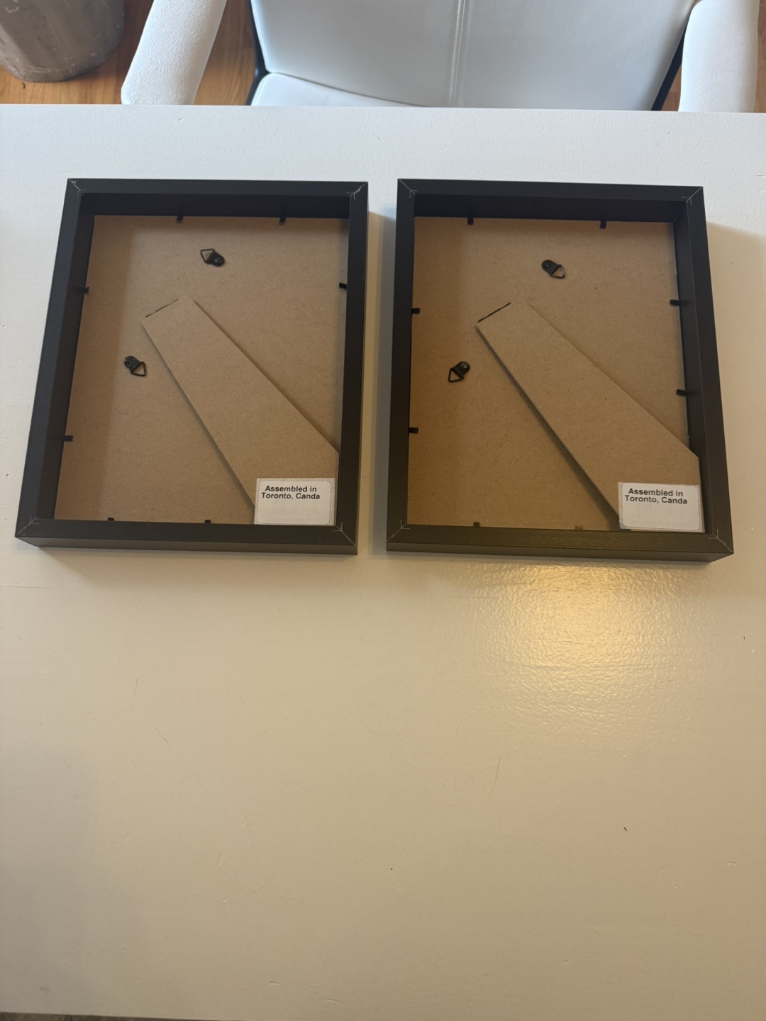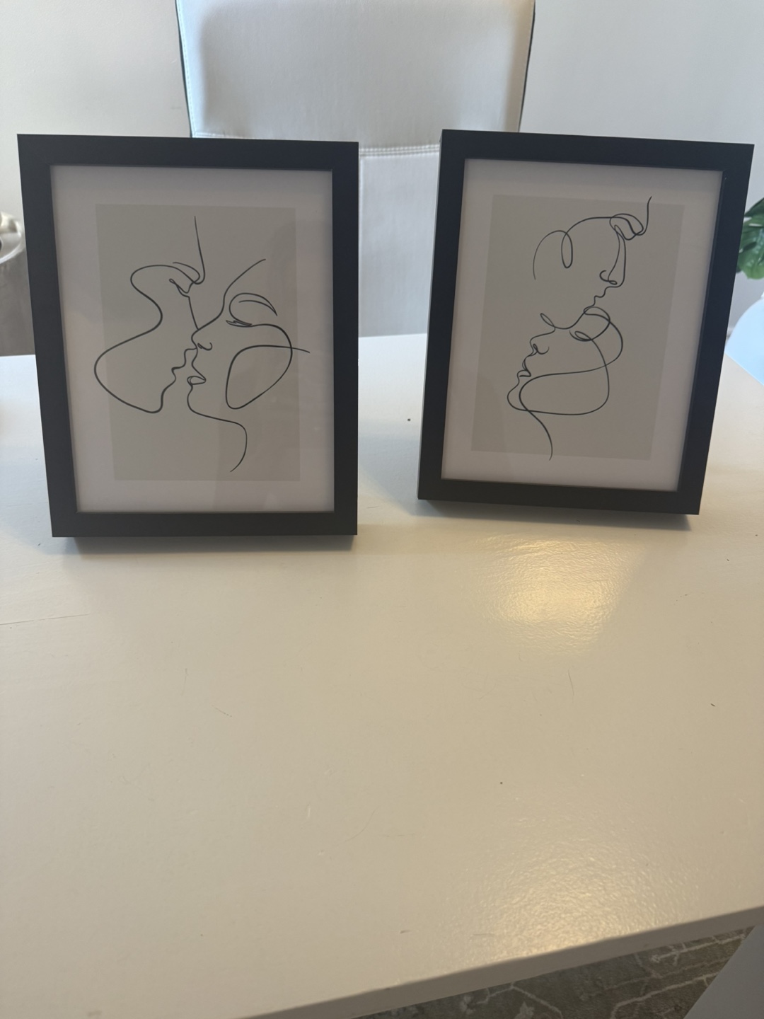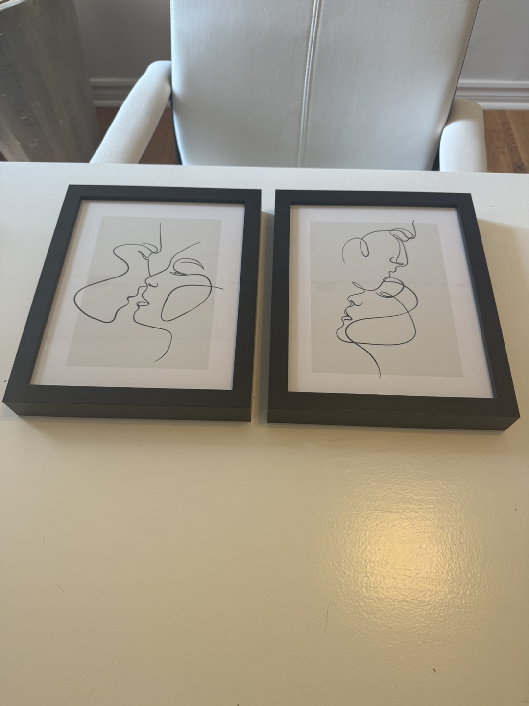 Selling a set of two framed line art prints. These pieces are assembled in Toronto, Canada, adding a local touch to your decor. The simple, elegant designs would complement any room!