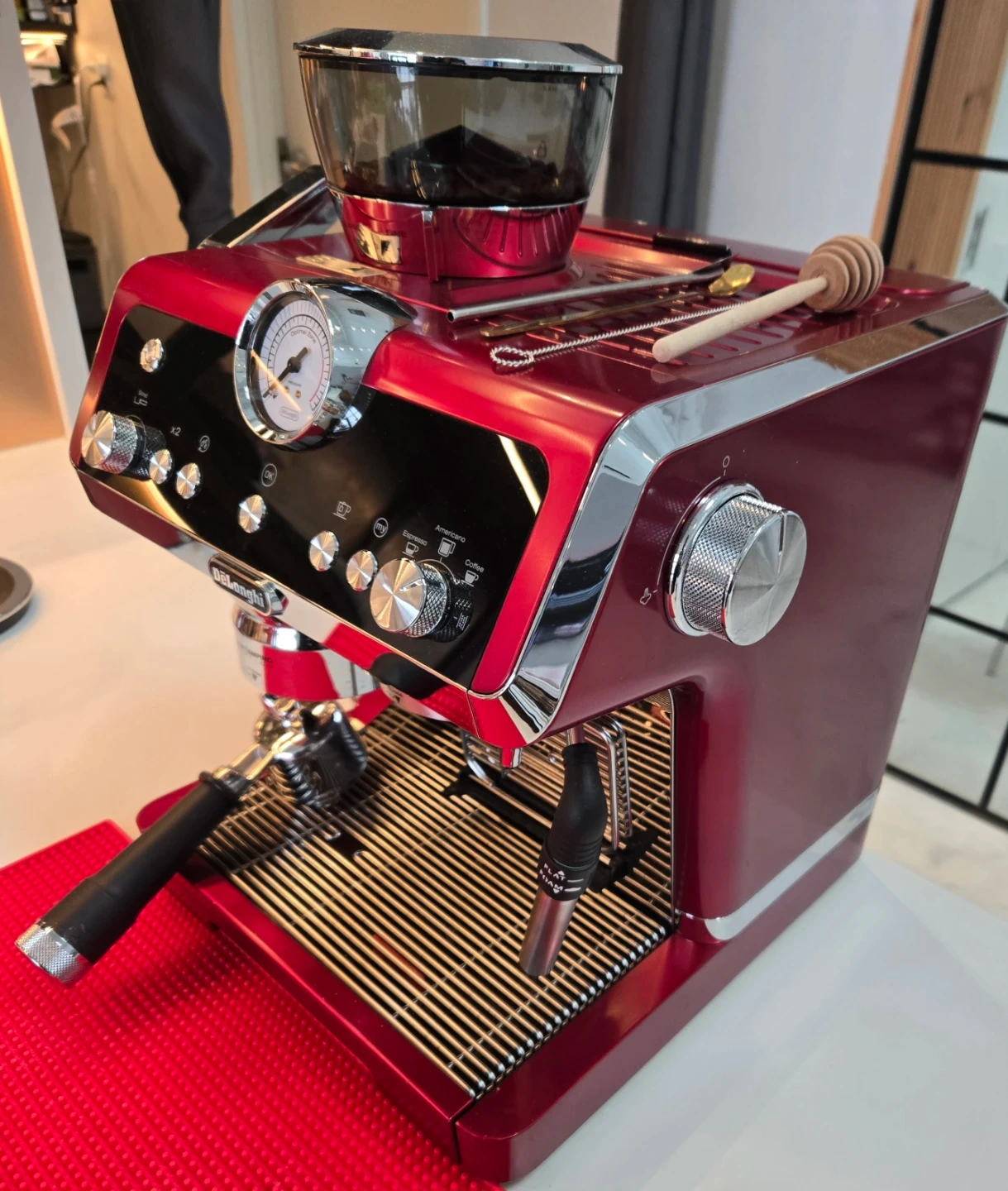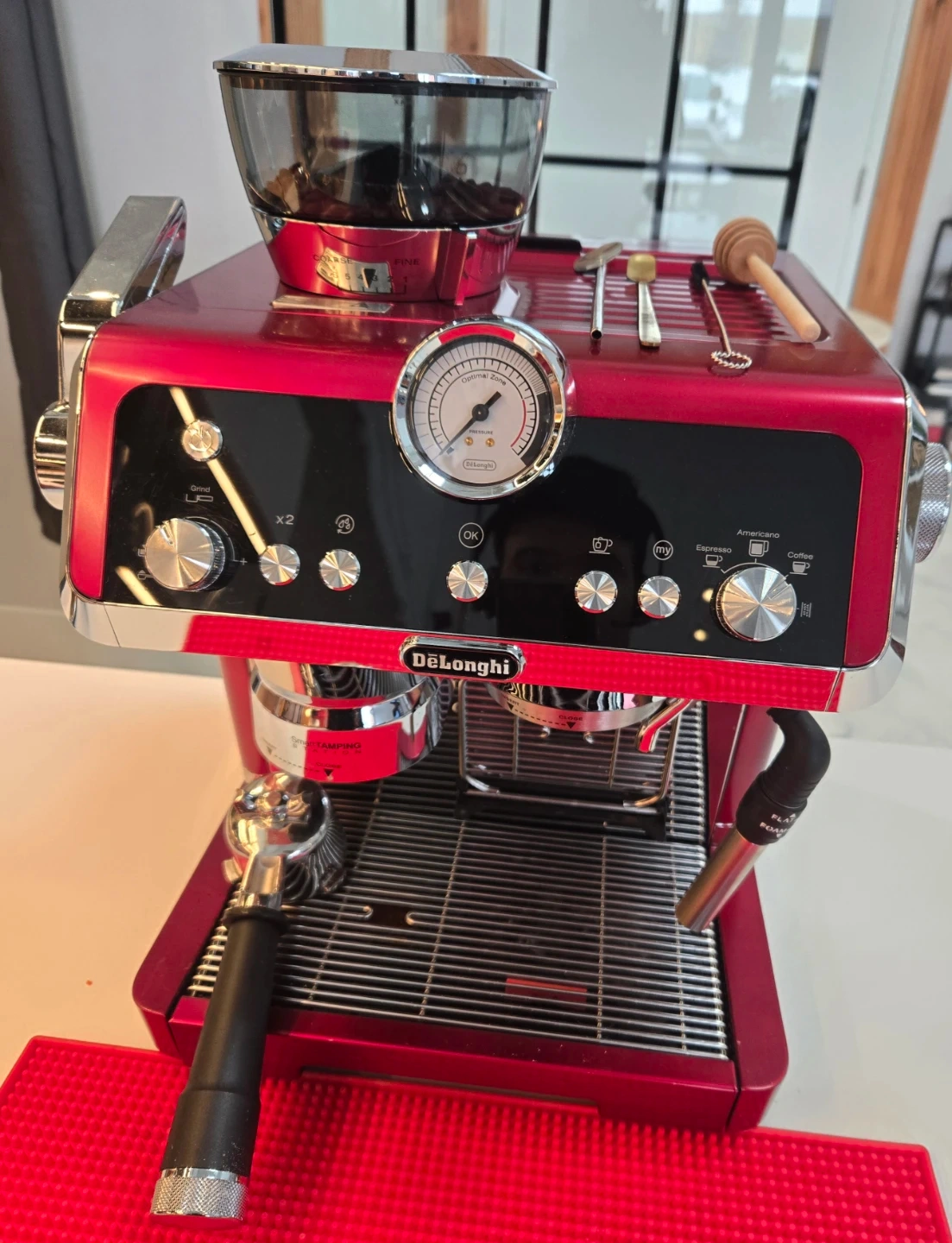 This DeLonghi La Specialista espresso machine is red. It features a built-in grinder and comes with a portafilter, tamper, and milk frothing wand. It has controls for Americano, Espresso, and Coffee. Like New.
