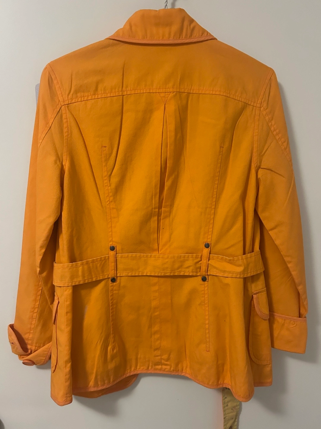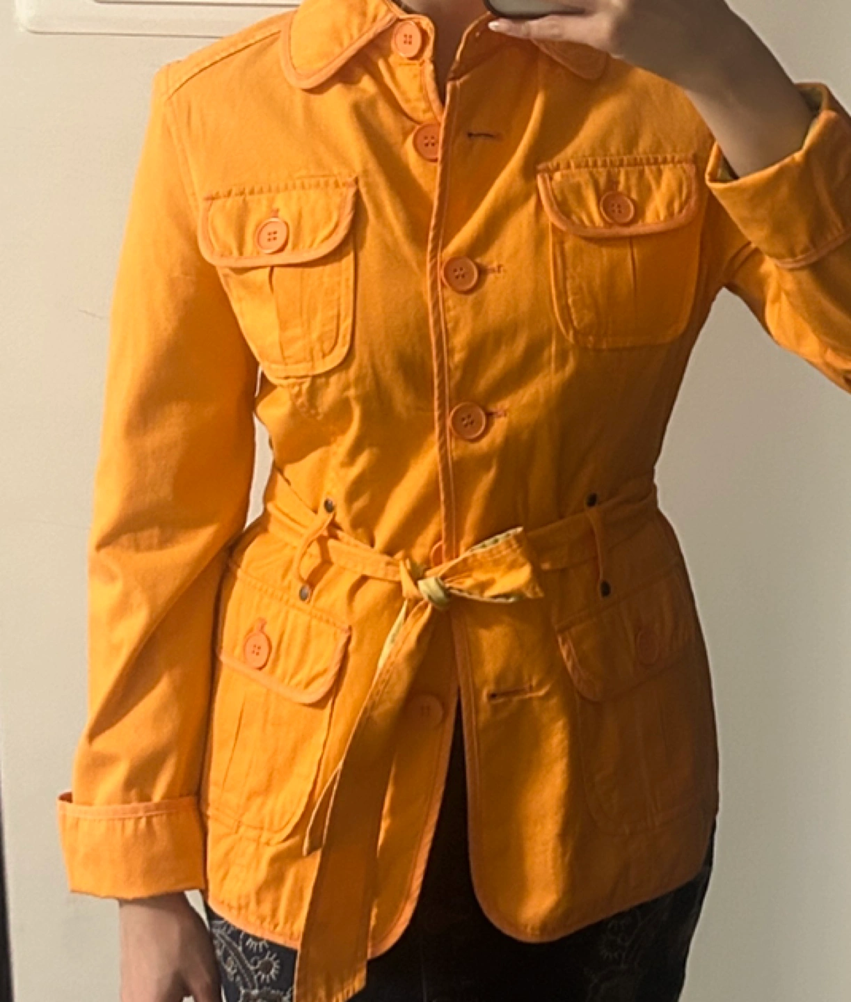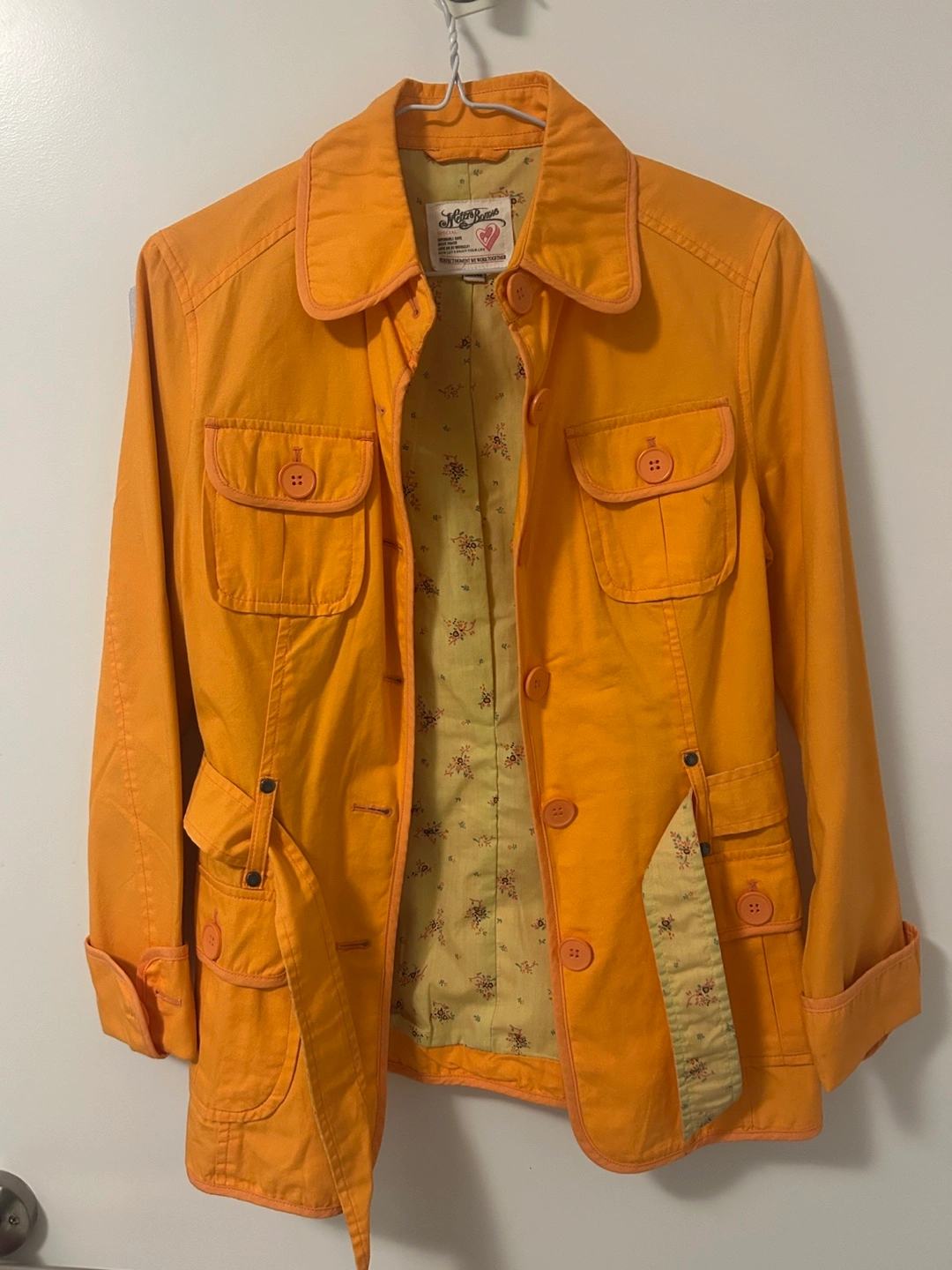 Women's orange utility jacket. Features long sleeves, button closure, pockets, and a belt. Lined with a pretty floral pattern. Great for spring or fall.