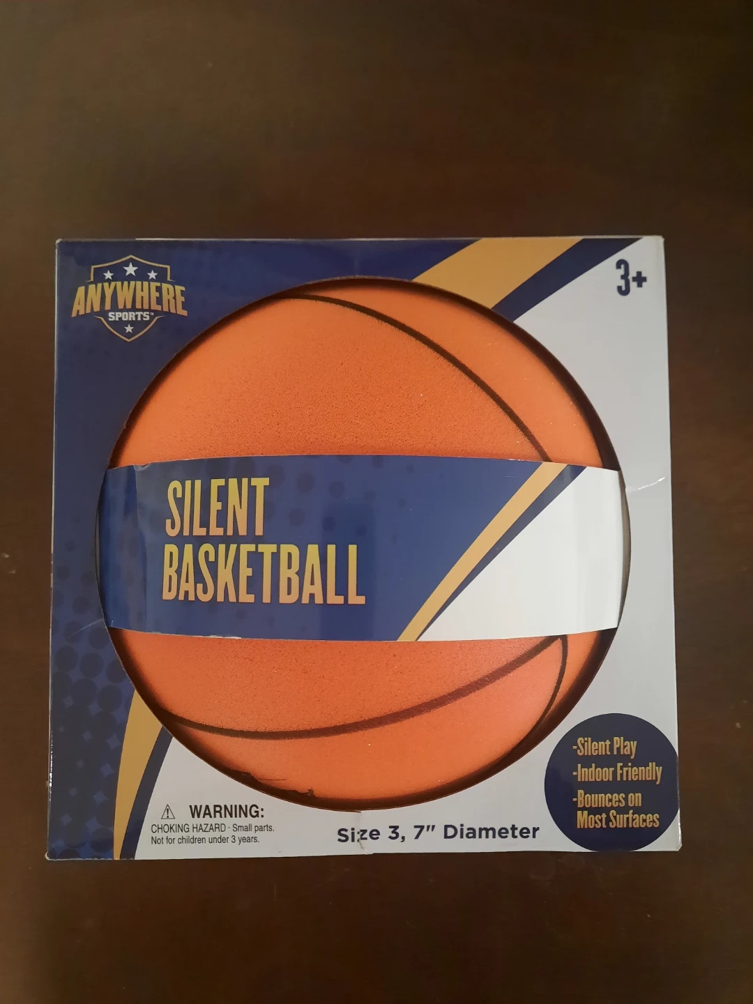 This is a 7-inch silent basketball from Anywhere Sports. It's designed for indoor play and bounces well on most surfaces! It's suitable for ages 3 and up.