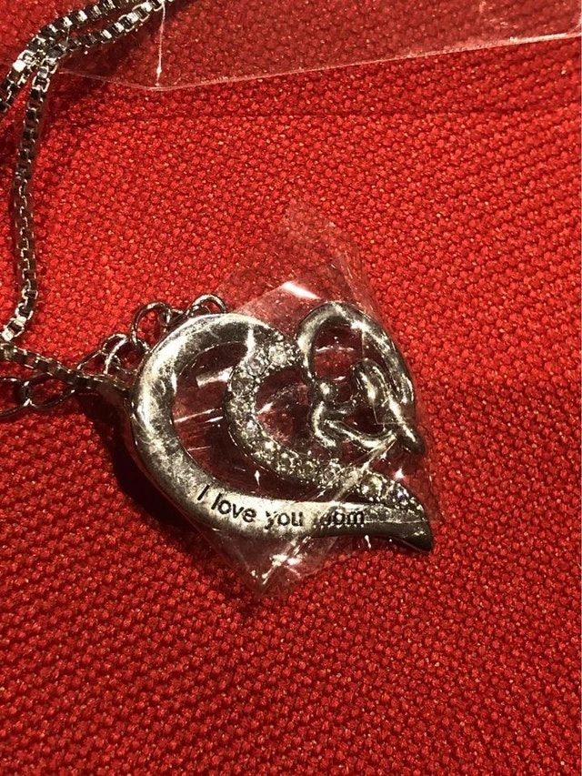 "I Love You Mom" pendant and chain. Includes a gift box. Sparkly and pretty. Only $5 for one or 2 for $8! Priced low because we're clearing stock from a previous business. Please see my other ads!