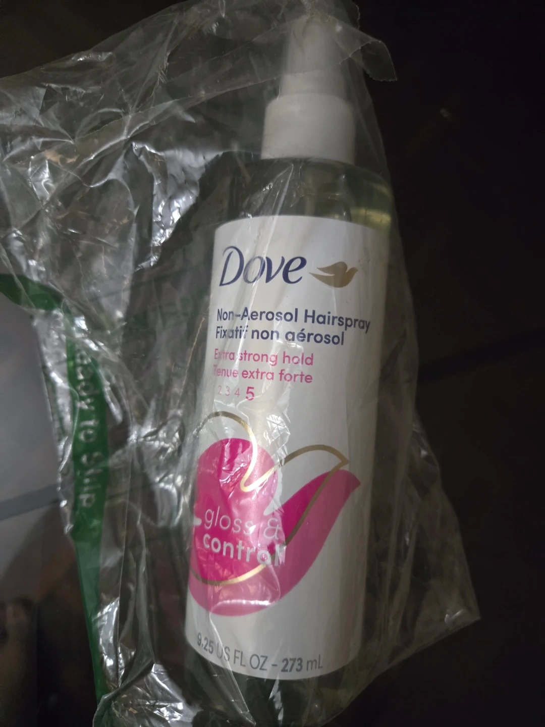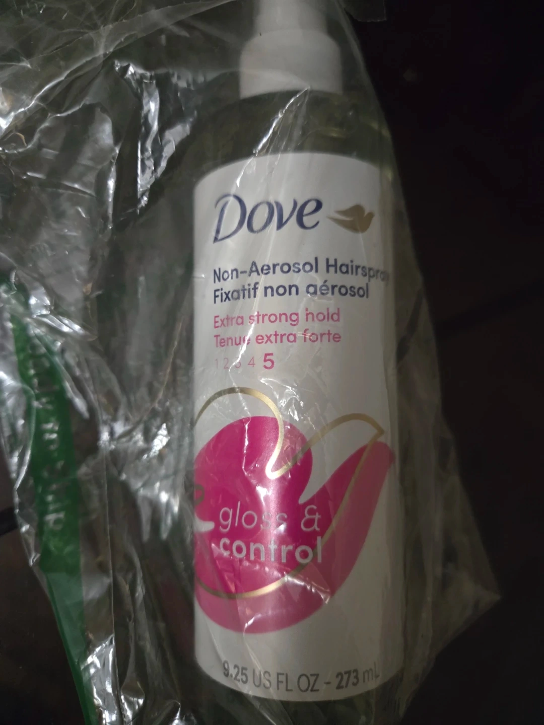 Selling a bottle of Dove Non-Aerosol Hairspray. It's the Extra Strong Hold version, perfect for keeping your hair in place. The bottle contains 9.25 US FL OZ - 273 mL, so it'll last you a while! Great for gloss and control
