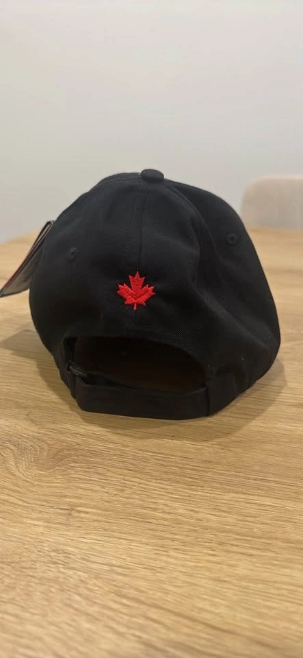 Brand new black baseball cap with a white embroidered Mercedes-Benz logo on the front and a red maple leaf embroidered on the back. Features adjustable strap and white trim on the brim.