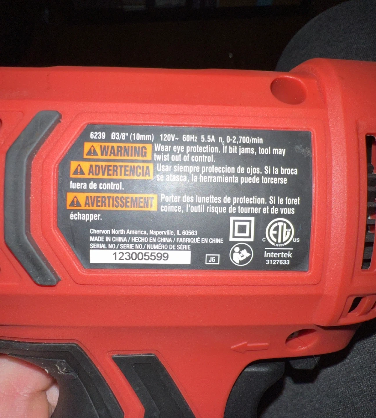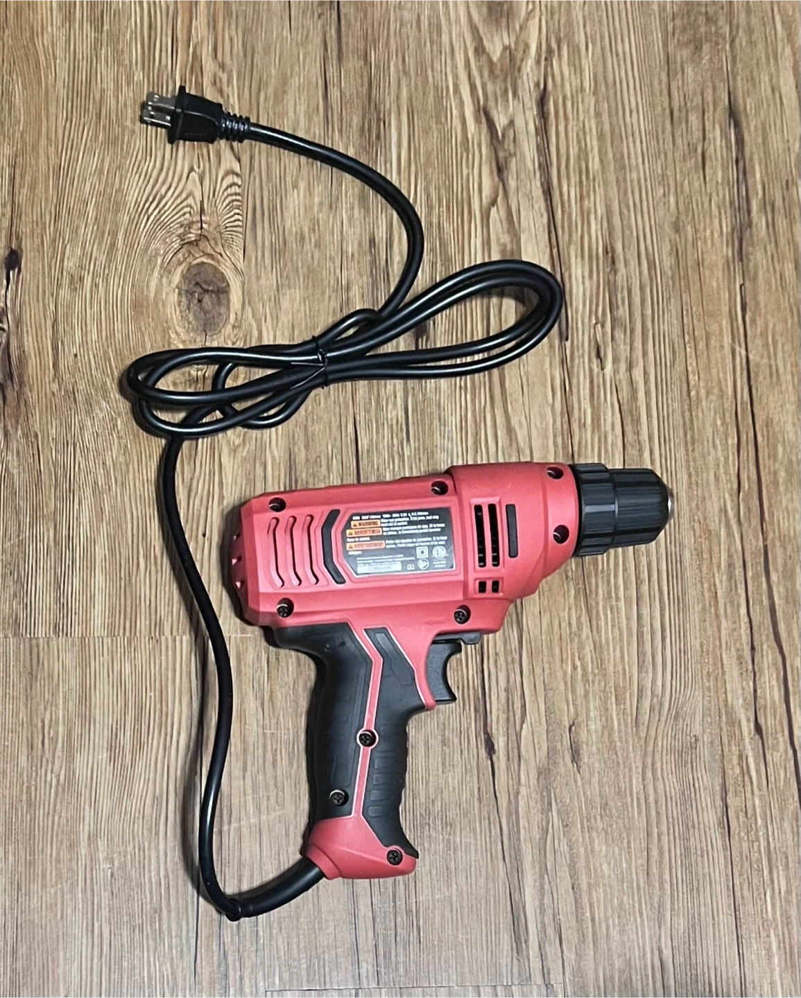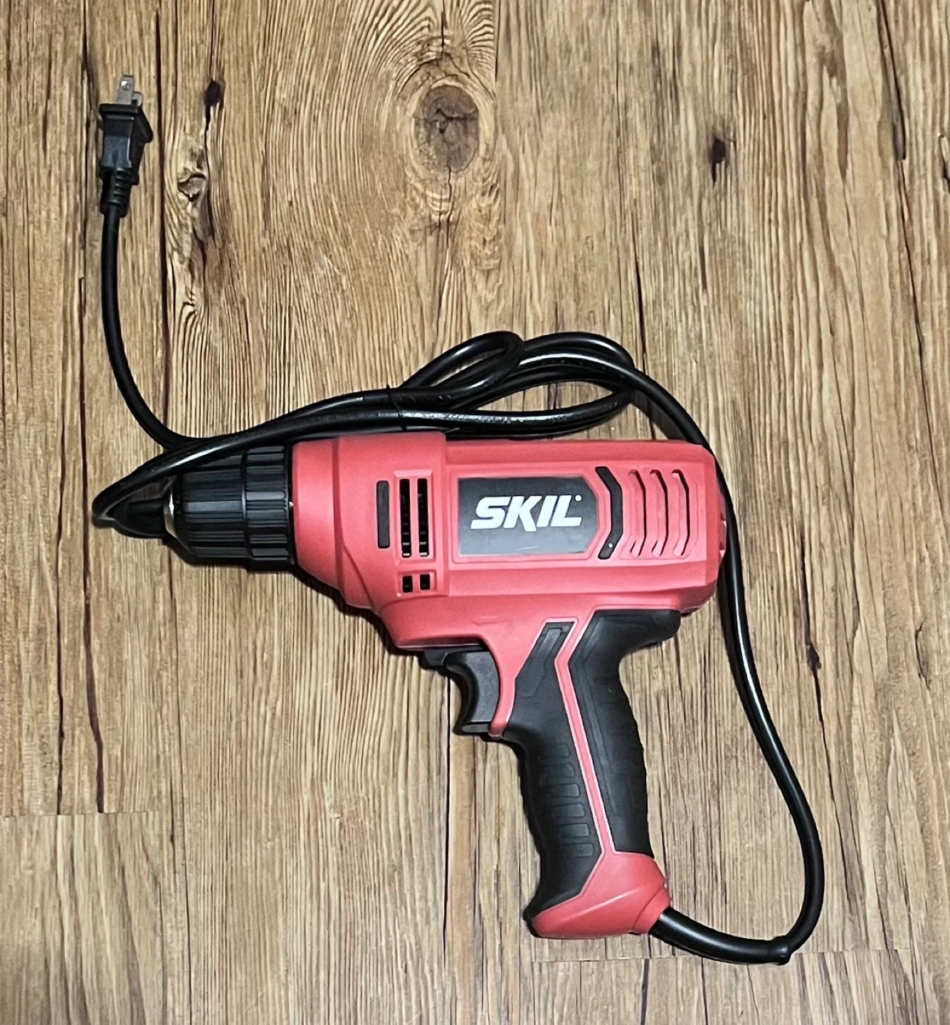 This is a red SKIL 3/8" (10mm) corded drill. It runs on 120V, 5.5A and has a no-load speed of 0-2,700/min. Safety glasses are recommended when operating. This drill is useful for various home repair and DIY projects.
