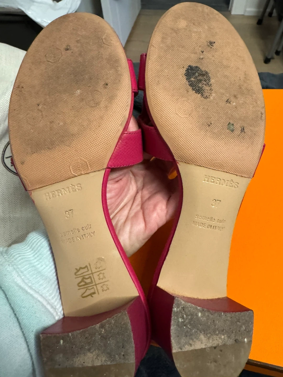 High heel sandal in suede goatskin with iconic "H" cut-out.
