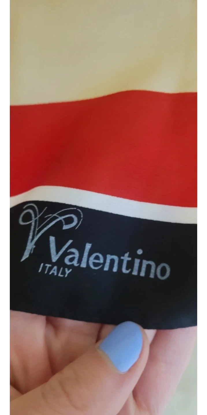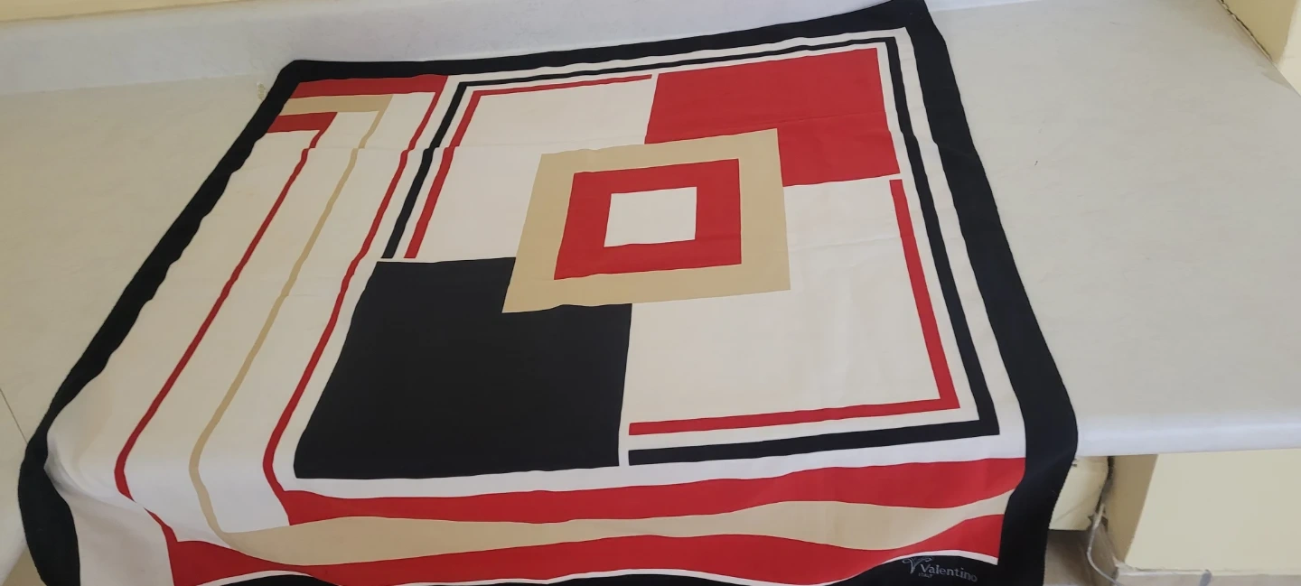 A stylish viintage valentino Italy scarf featuring a bold geometric pattern in red, black, and cream. Made from 100% polyester. Measures approximately 30" x 30".