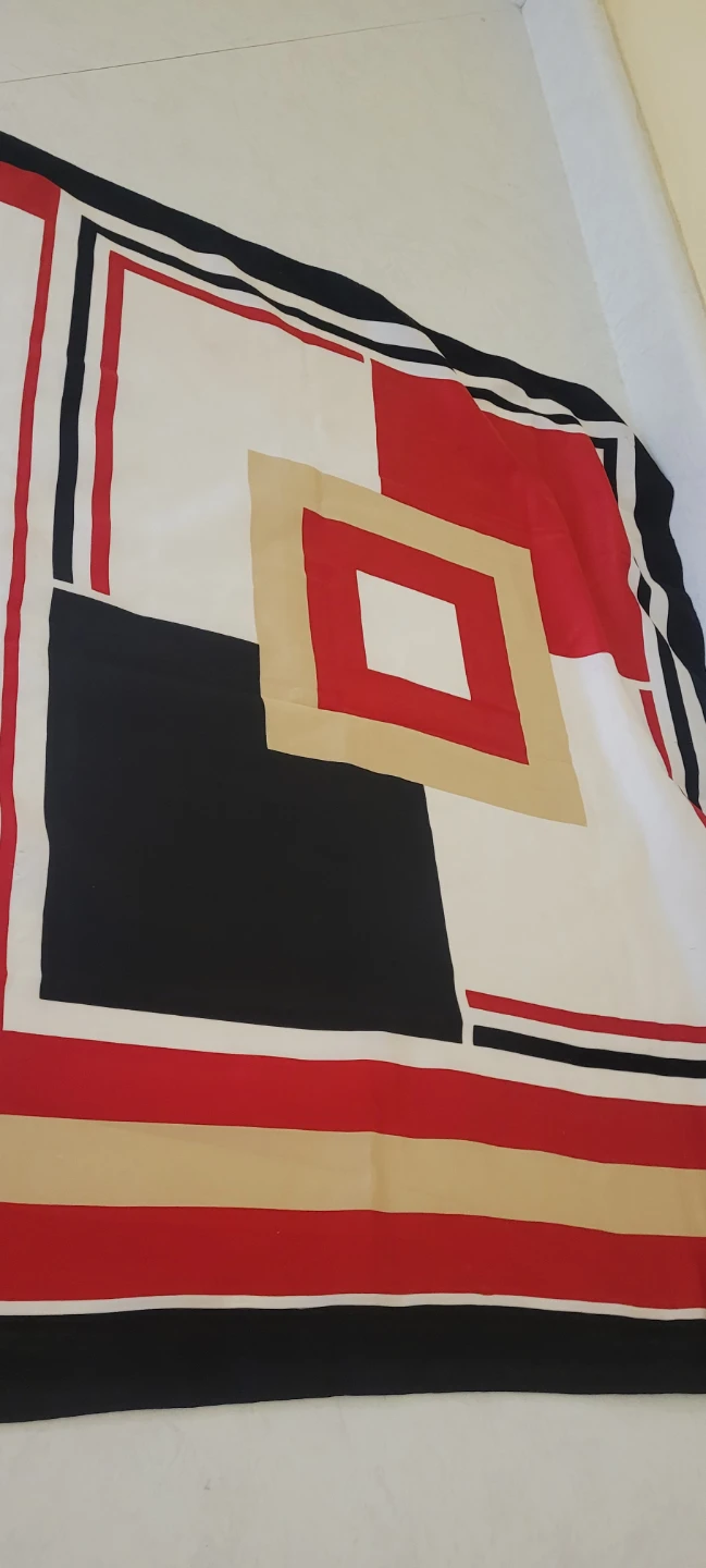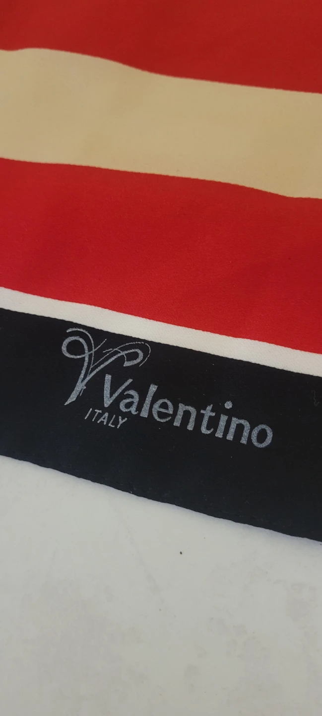 A stylish viintage valentino Italy scarf featuring a bold geometric pattern in red, black, and cream. Made from 100% polyester. Measures approximately 30" x 30".