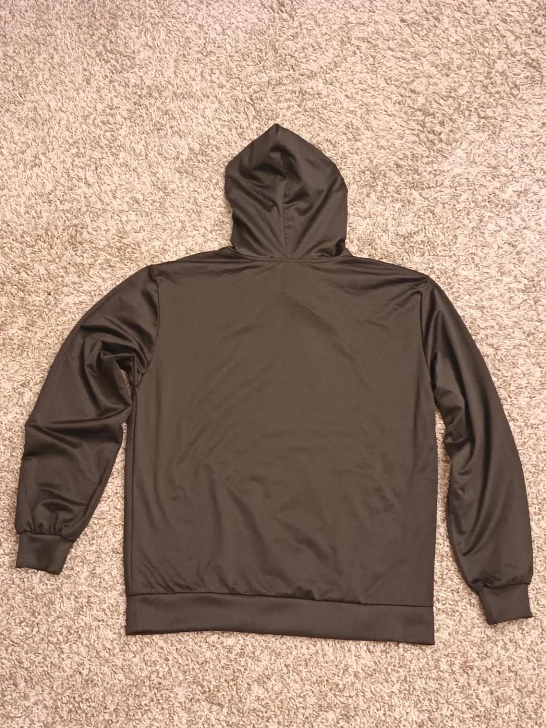 This is a black hoodie with a front pocket and drawstring hood. It's made of a smooth, synthetic material. It's suitable for casual wear.