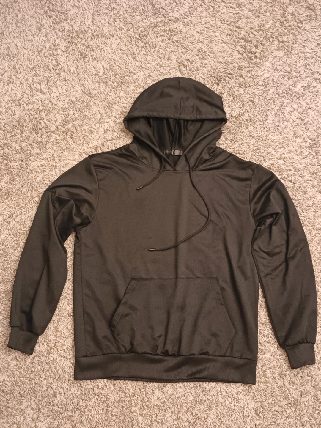 This is a black hoodie with a front pocket and drawstring hood. It's made of a smooth, synthetic material. It's suitable for casual wear.