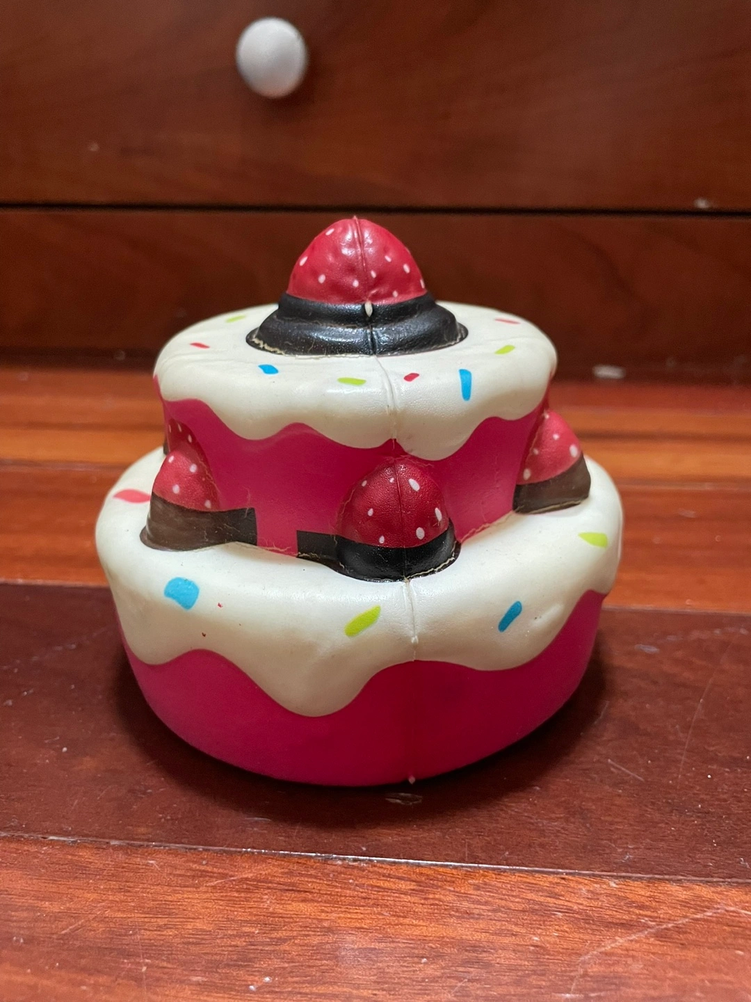 A colourful cake-shaped squishy toy. It features two tiers, topped with a strawberry. Comes with sprinkles. You can gently squeeze this to release any stress.
