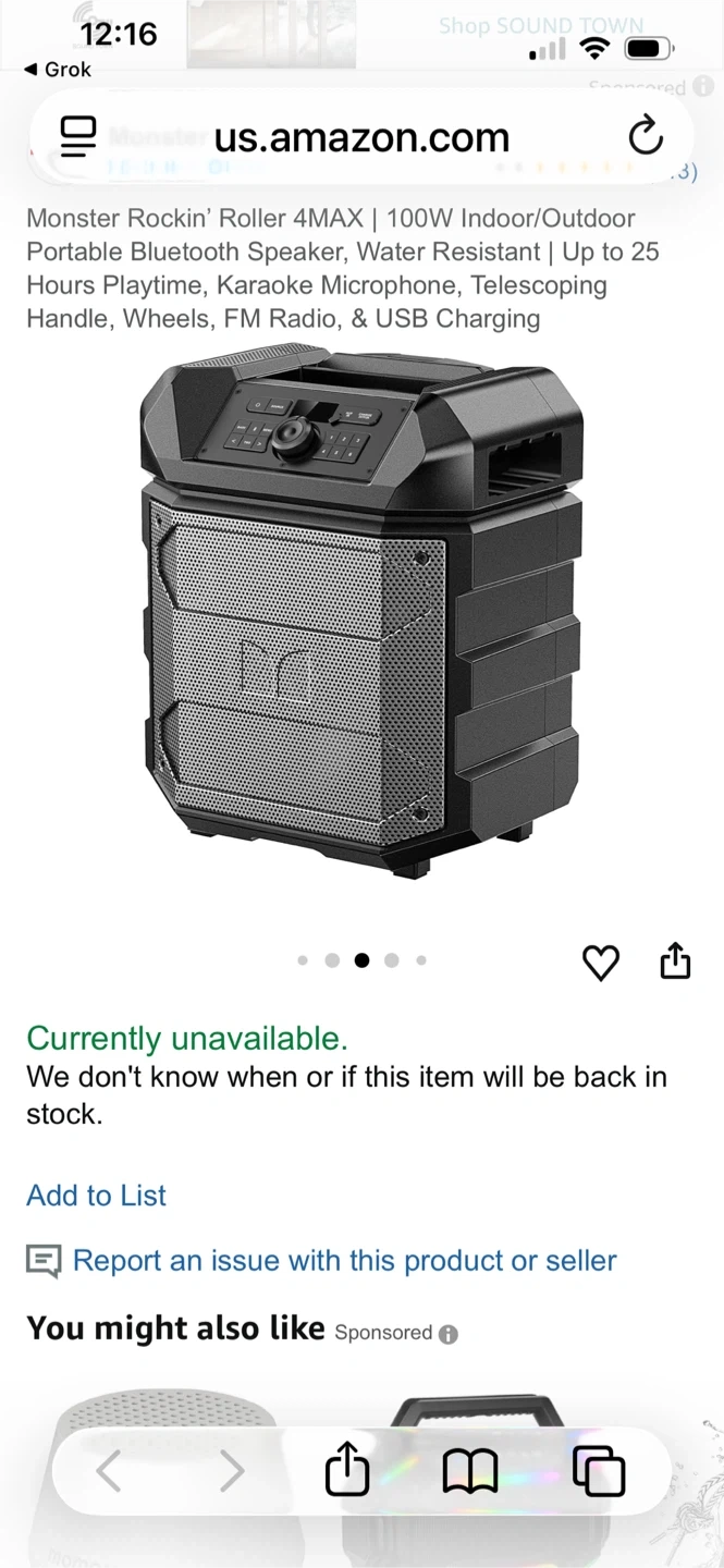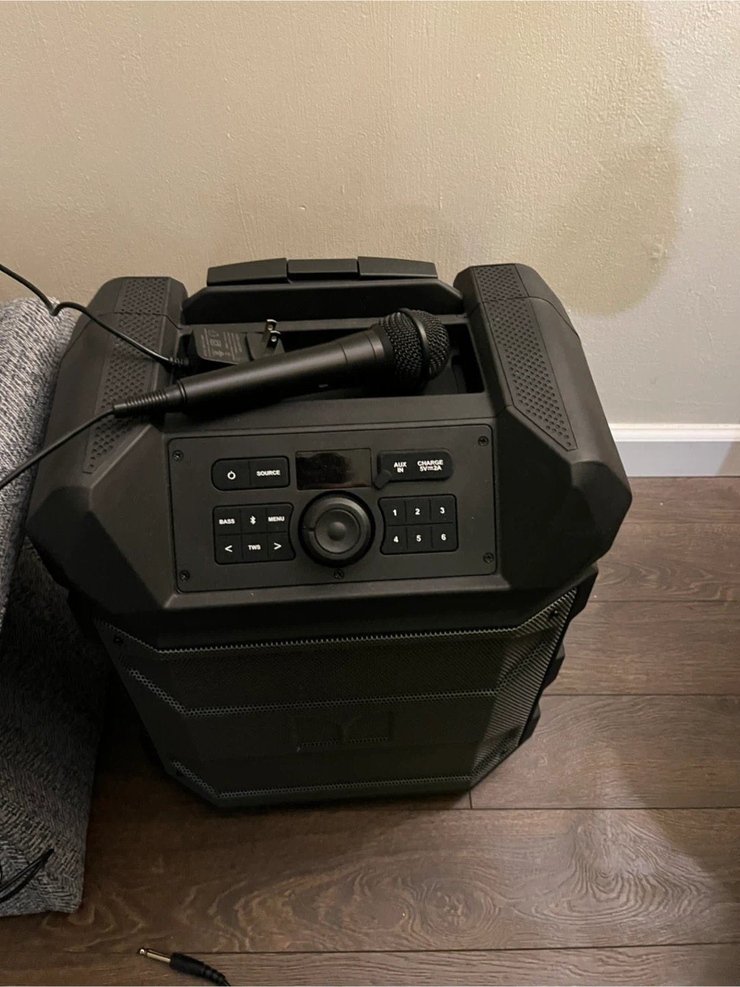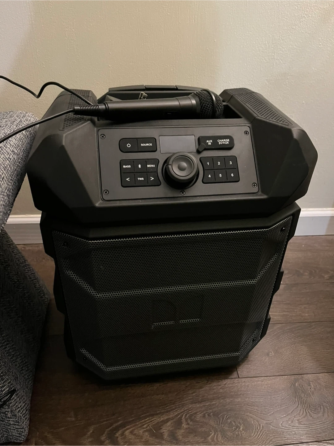 Selling a Monster Rockin' Roller 4MAX portable Bluetooth speaker! It's water-resistant and provides up to 25 hours of playtime. It also comes with a karaoke microphone, telescoping handle, wheels, FM radio, and USB charging