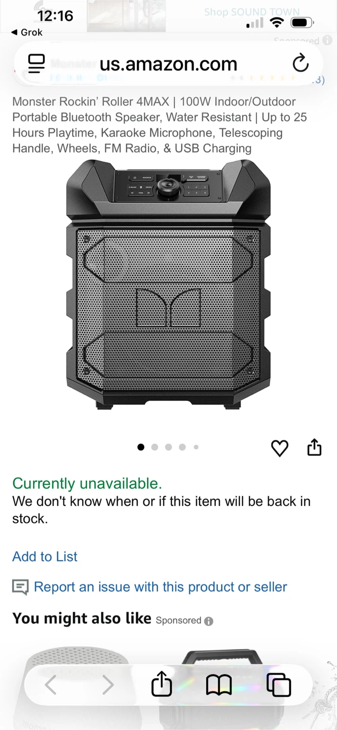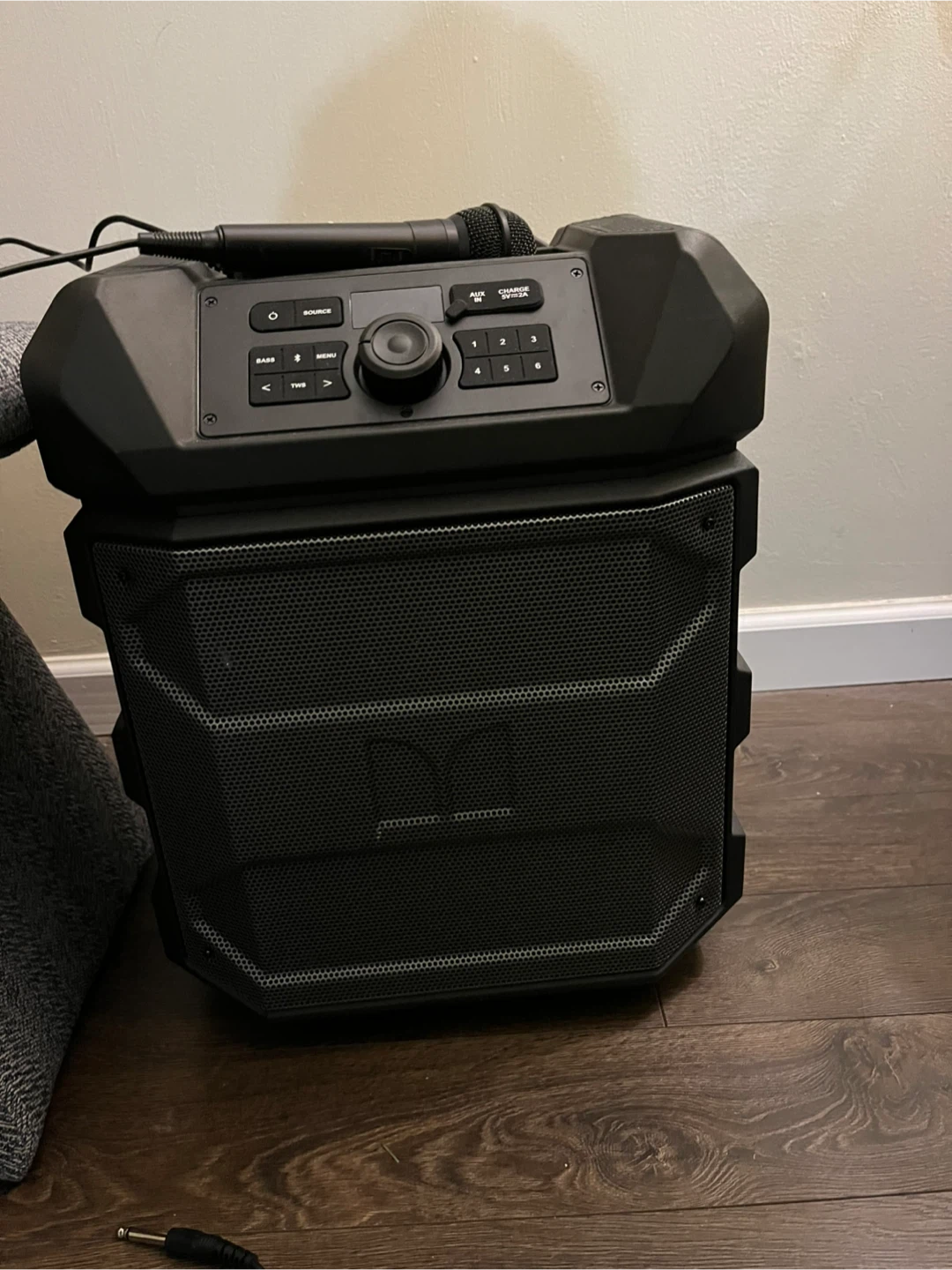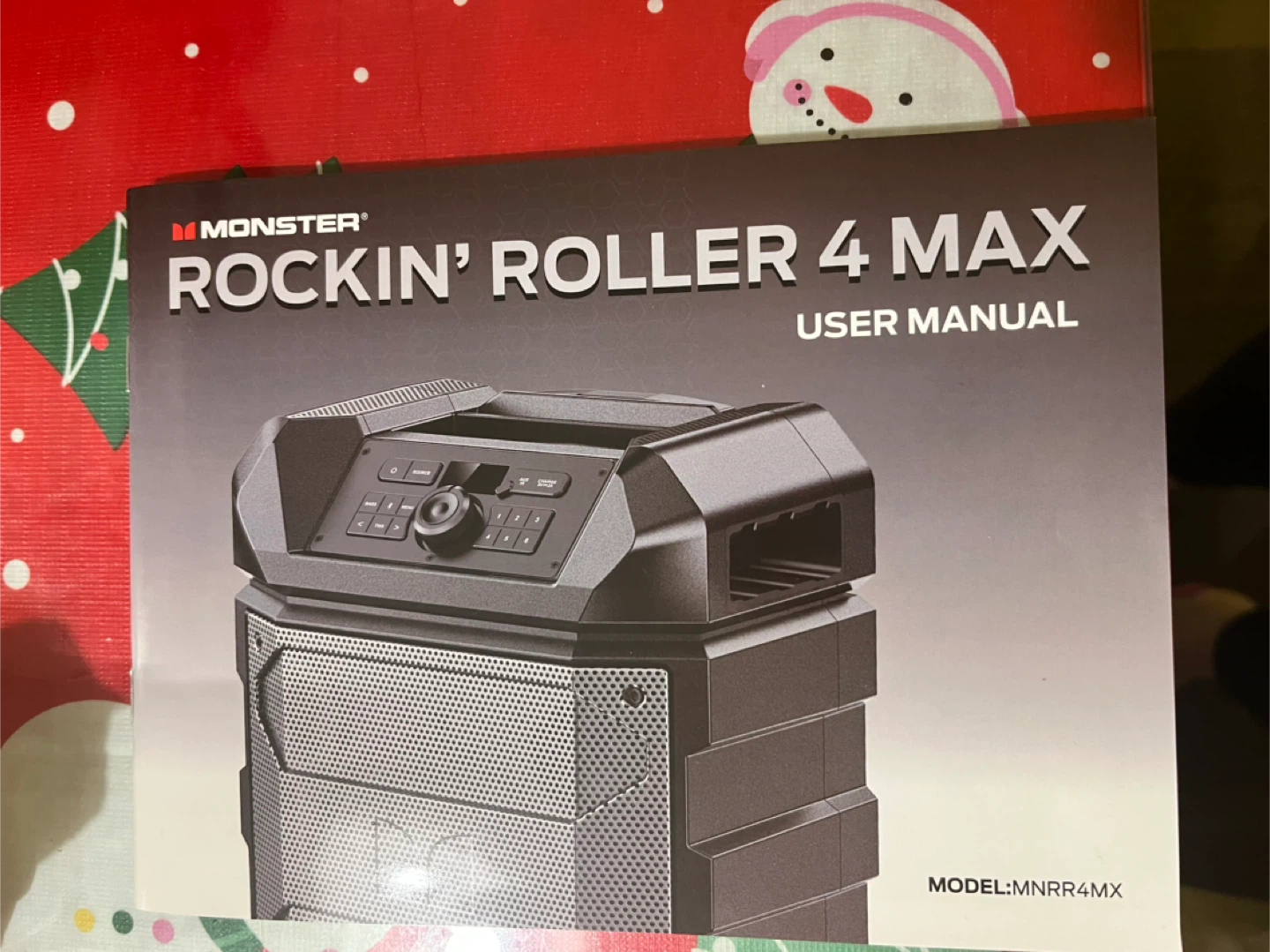Selling a Monster Rockin' Roller 4MAX portable Bluetooth speaker! It's water-resistant and provides up to 25 hours of playtime. It also comes with a karaoke microphone, telescoping handle, wheels, FM radio, and USB charging