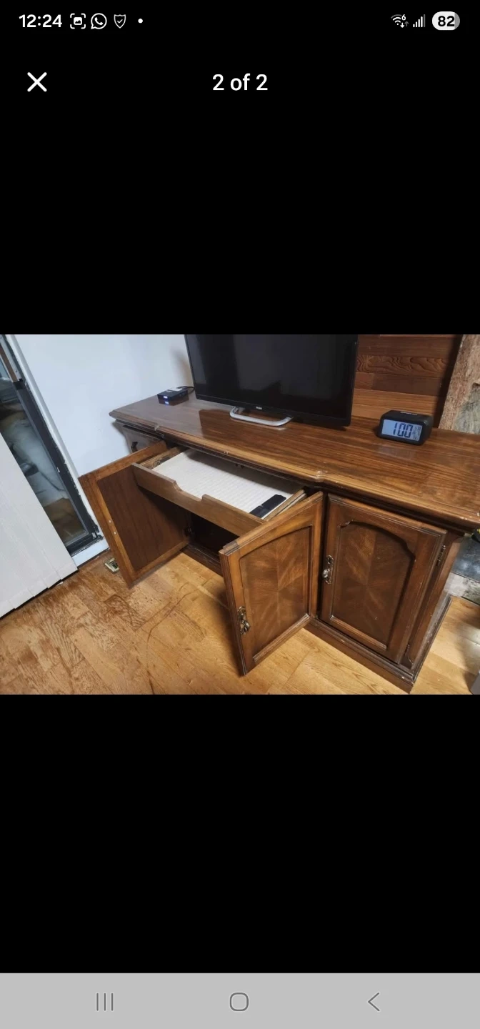 Solid wood media console featuring four cabinet doors and a pull-out drawer for media components. Plenty of storage space for electronics and accessories.