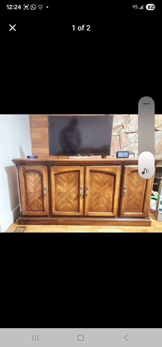 Solid wood media console featuring four cabinet doors and a pull-out drawer for media components. Plenty of storage space for electronics and accessories.