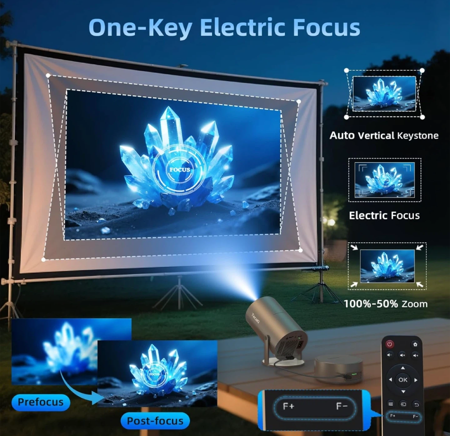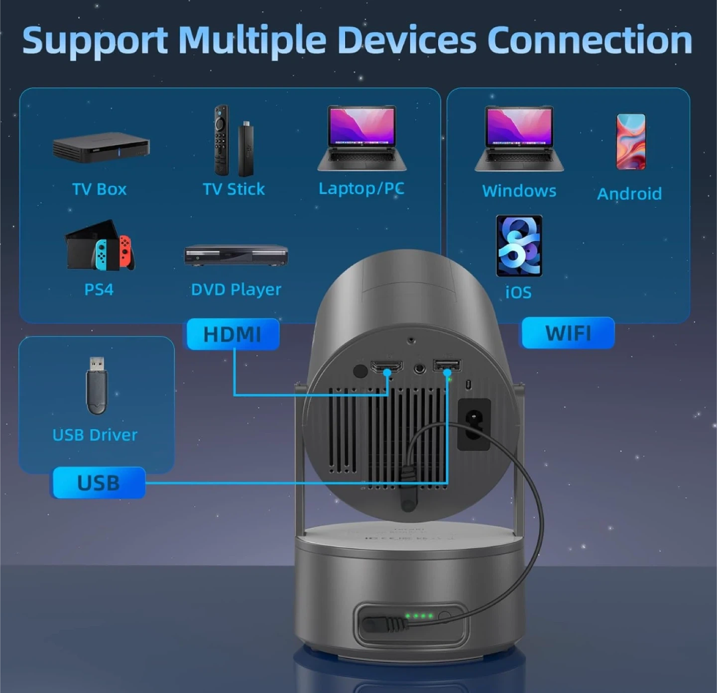 Anytime, Anywhere Projection – At just 4 lbs with built-in battery, toss this portable mini projector in any bag. Its 180° pivot design beams video onto walls, floors, or even ceilings. Enjoy cinema-sized screens from 30" to 200" instantly
