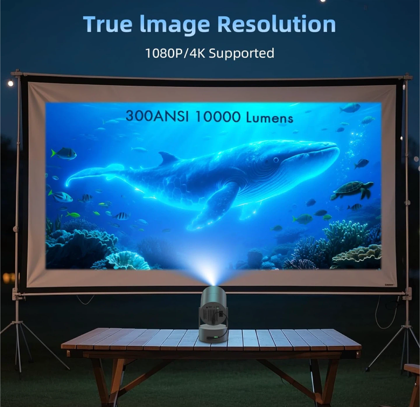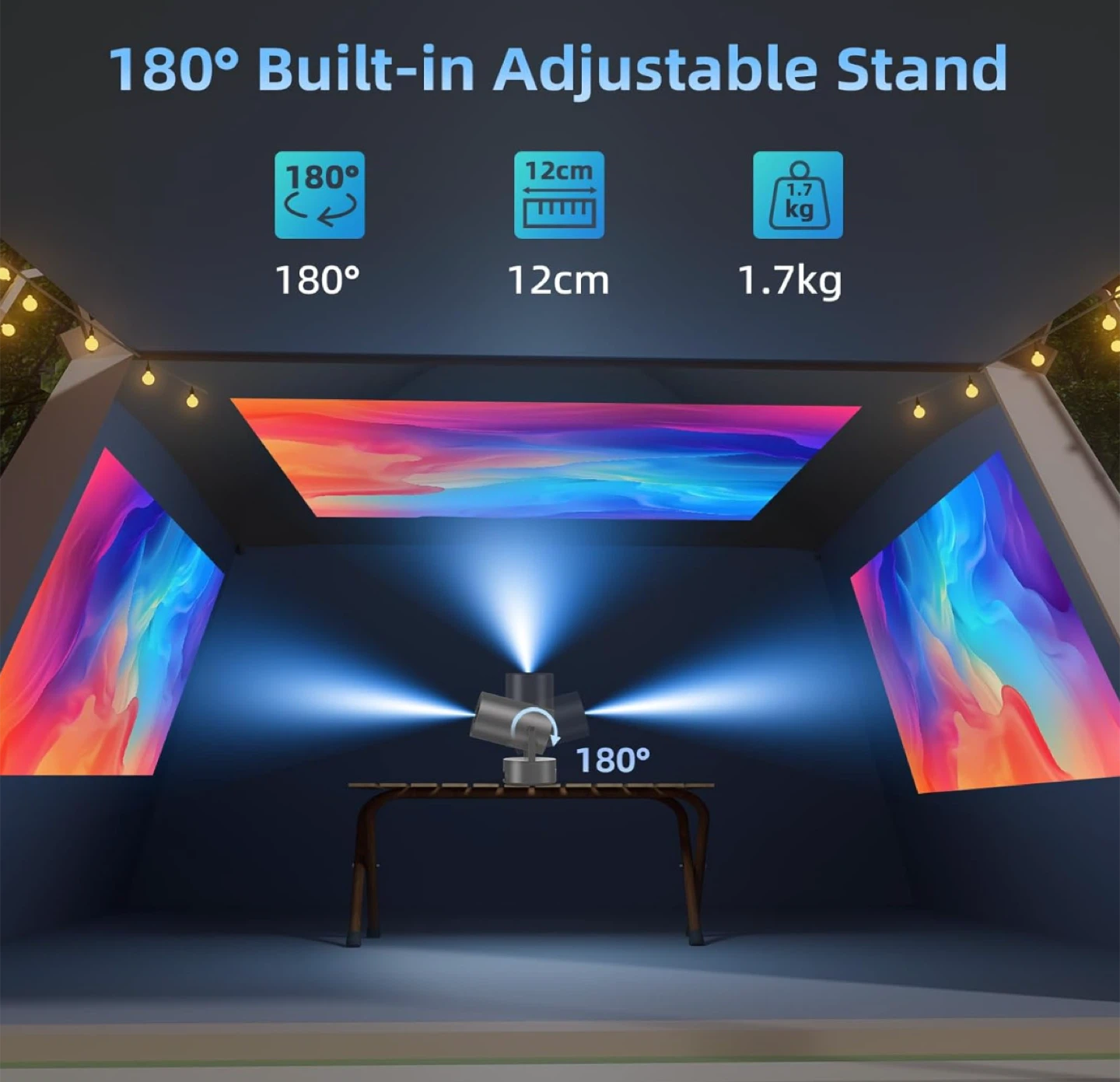 Anytime, Anywhere Projection – At just 4 lbs with built-in battery, toss this portable mini projector in any bag. Its 180° pivot design beams video onto walls, floors, or even ceilings. Enjoy cinema-sized screens from 30" to 200" instantly