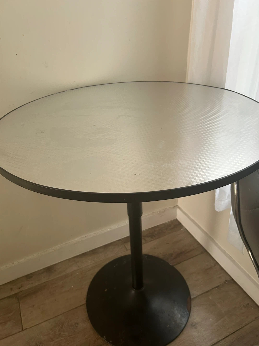 This is a round bistro table with a textured silver tabletop and a black pedestal base. It's a compact size, perfect for smaller spaces. The table's surface is easy to wipe clean. A great option for a breakfast nook or as an accent table!