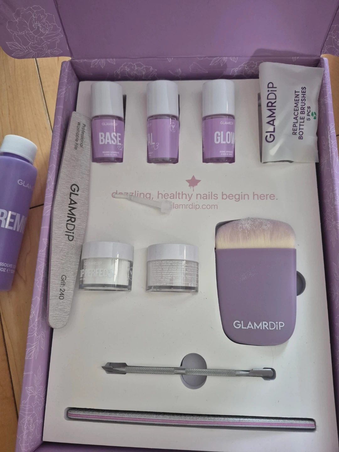 This GlamdiP dip powder nail kit. It also comes with a remover bottle, nail file, and manicure tool. The kit contains everything needed for a salon-quality manicure at home!