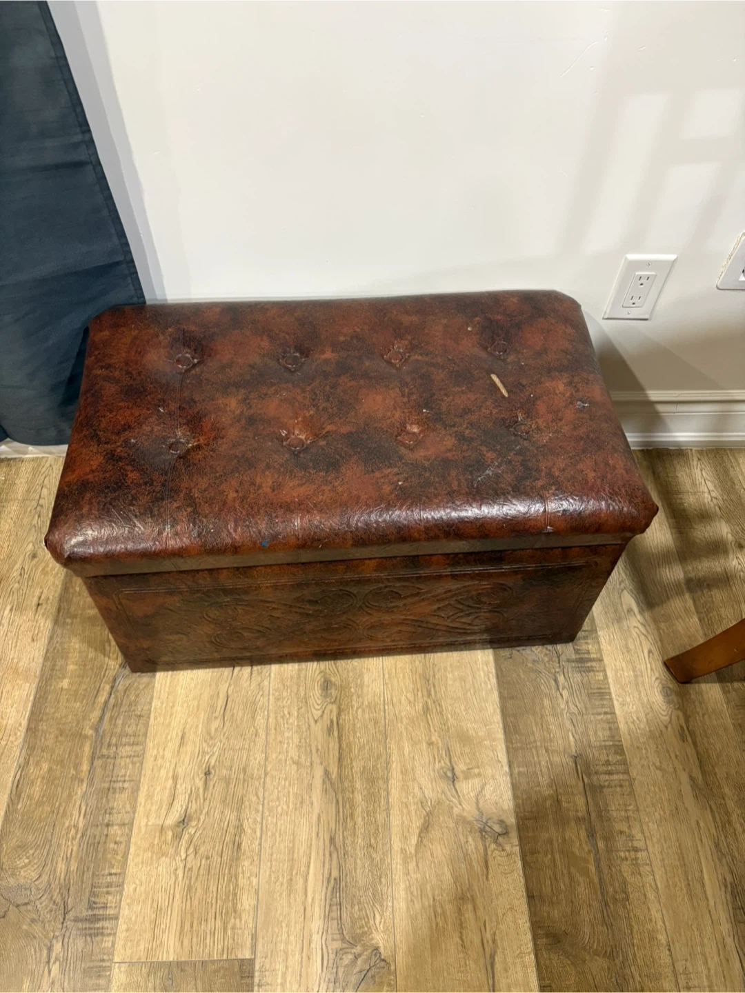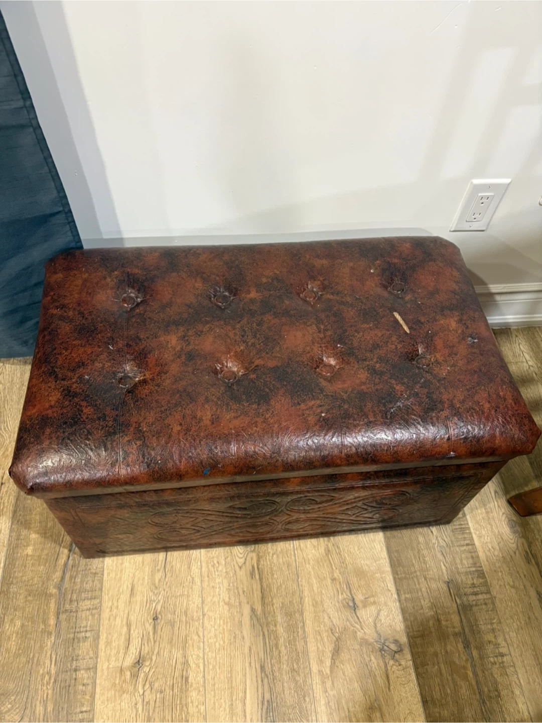 This faux leather storage ottoman has a rich, embossed design on the sides and a tufted lid. It's perfect for stowing away blankets, toys, or other household items. The interior is fully lined and hinged for easy access.