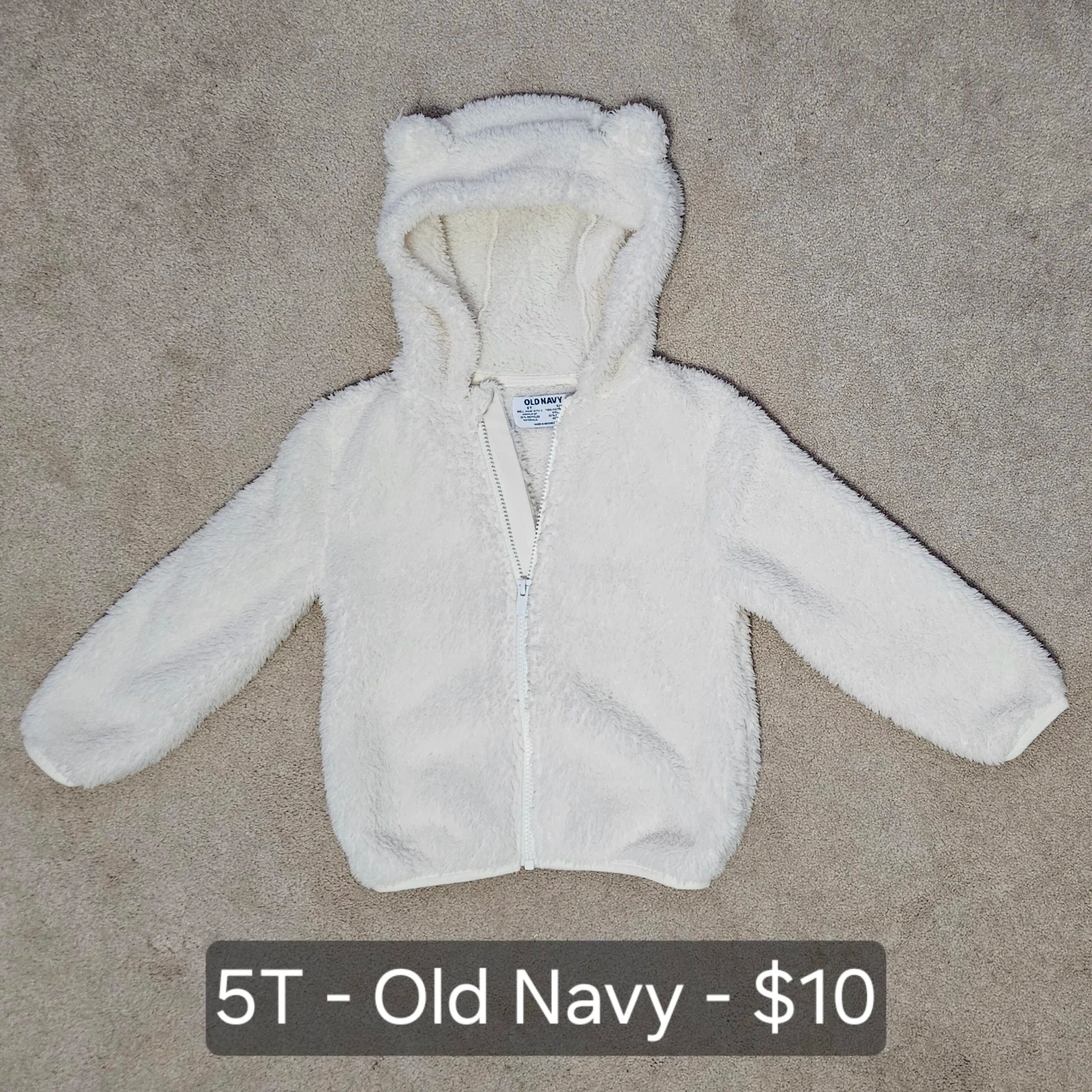 This Old Navy fuzzy hoodie is a cute white colour with bear ears on the hood. It's a size 5T and zips up the front. This cozy jacket is perfect for cooler weather!
