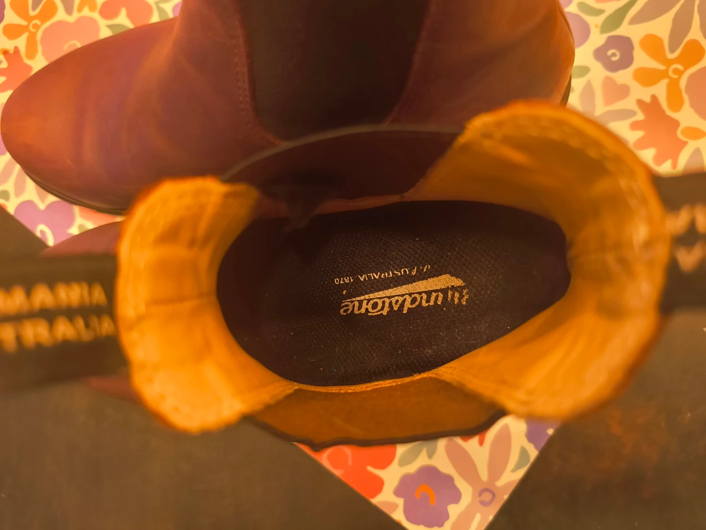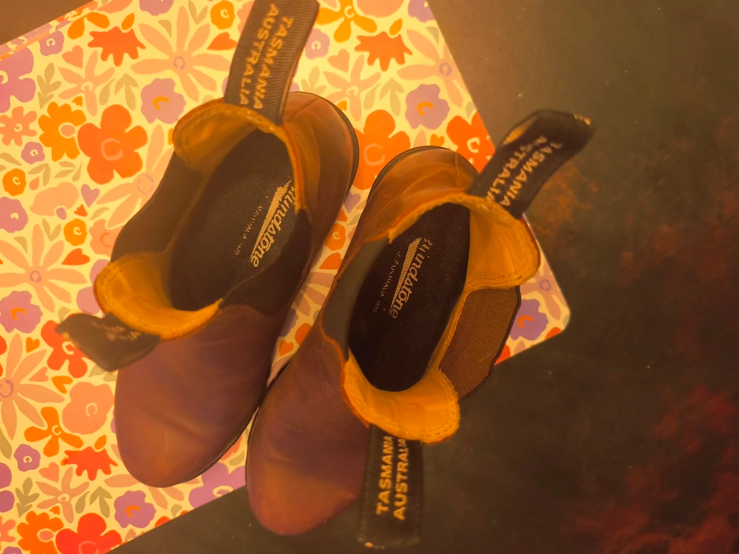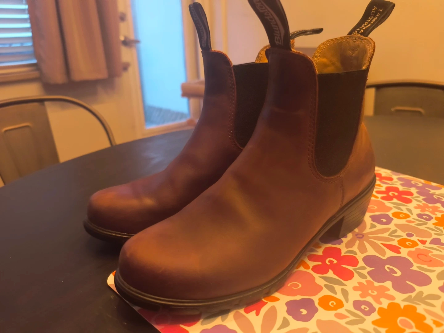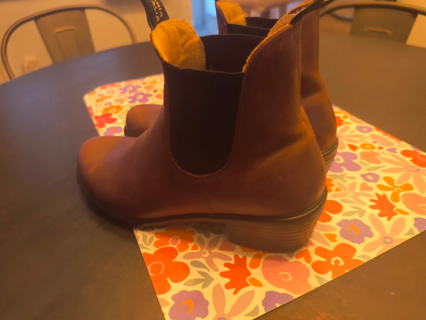 Brown leather Blundstone Chelsea boots. Easy to slip on and off. Durable construction for everyday wear.