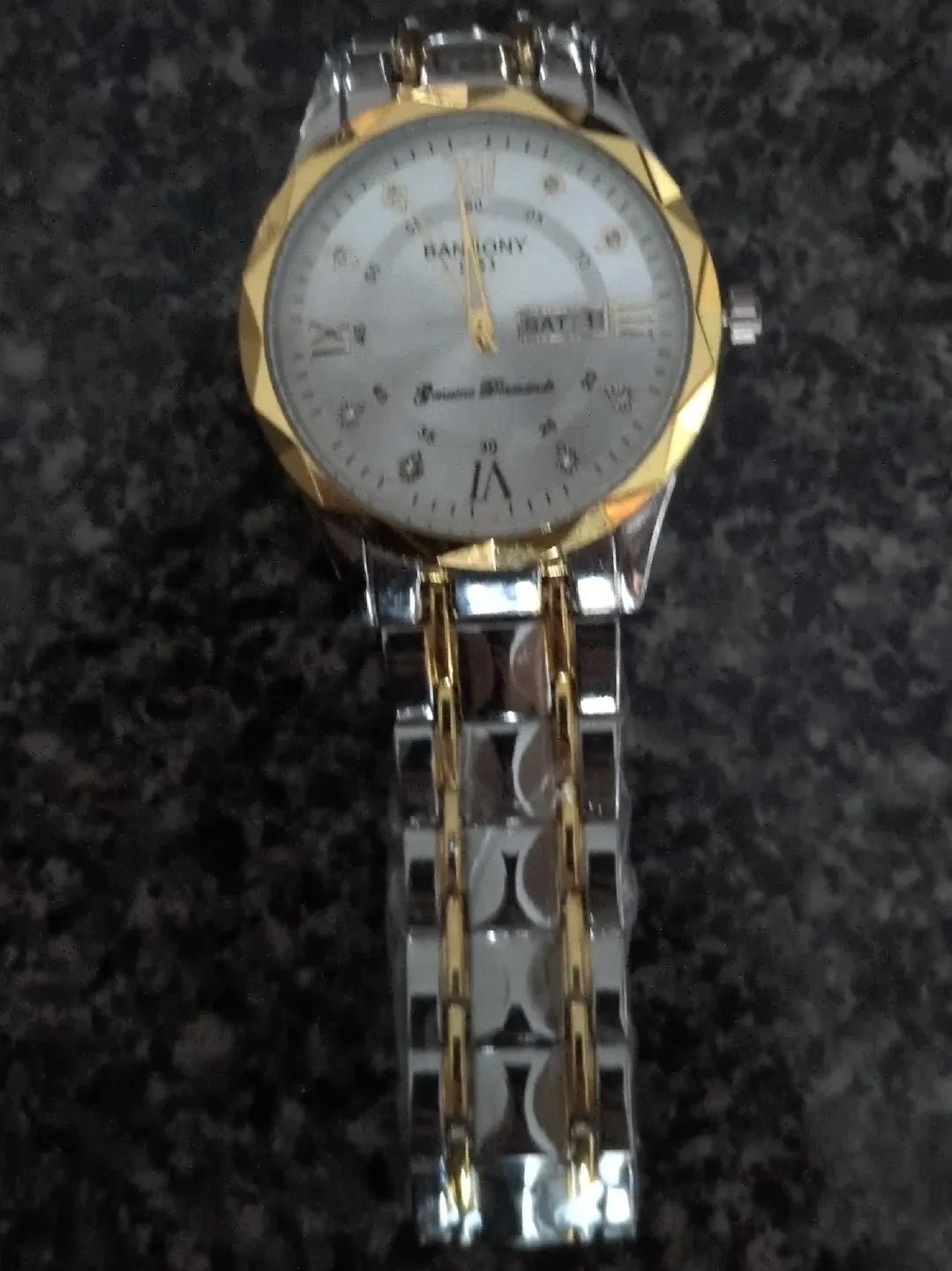 This is a BANLONY quartz watch with a two-tone stainless steel band. It displays the day and date on its face. The watch has a gold-tone bezel and hands.
