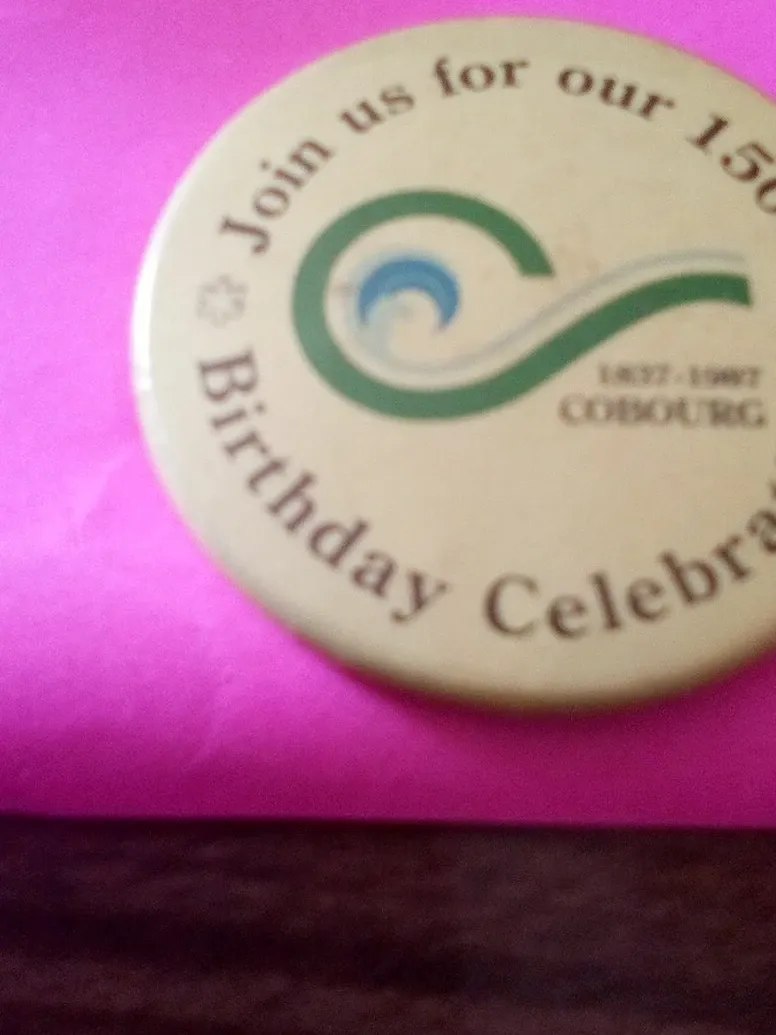 This pin commemorates Cobourg's 150th birthday celebration in 1987. It reads 'Join us for our 150th Birthday Celebration' and shows the years '1937-1987'. It's a fun piece of local history!
