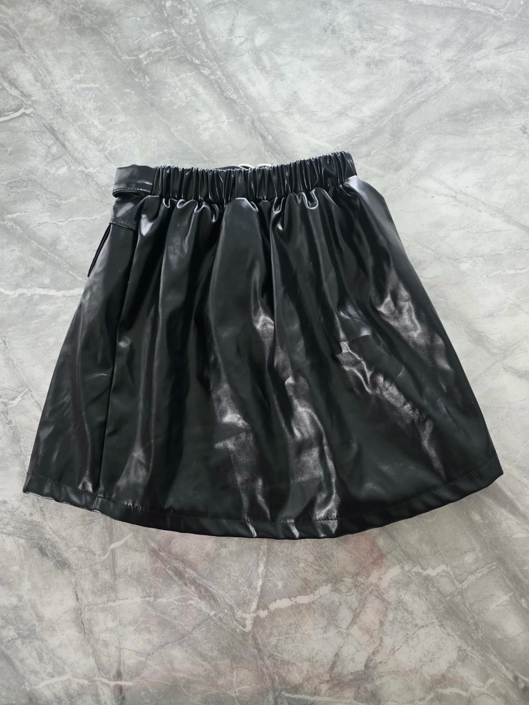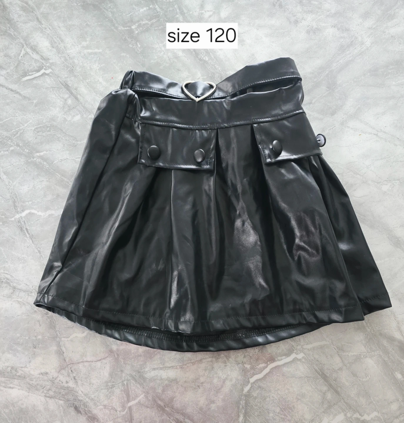 Cute black faux leather skirt for girls. Features a stylish belt with a heart buckle and buttoned pockets. Size 120, suitable for ages 4-5 years. It's made from a shiny faux leather material.