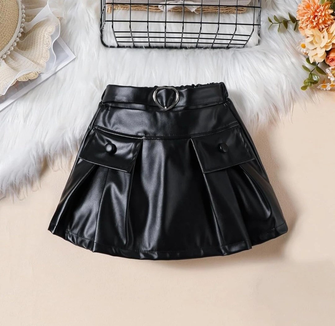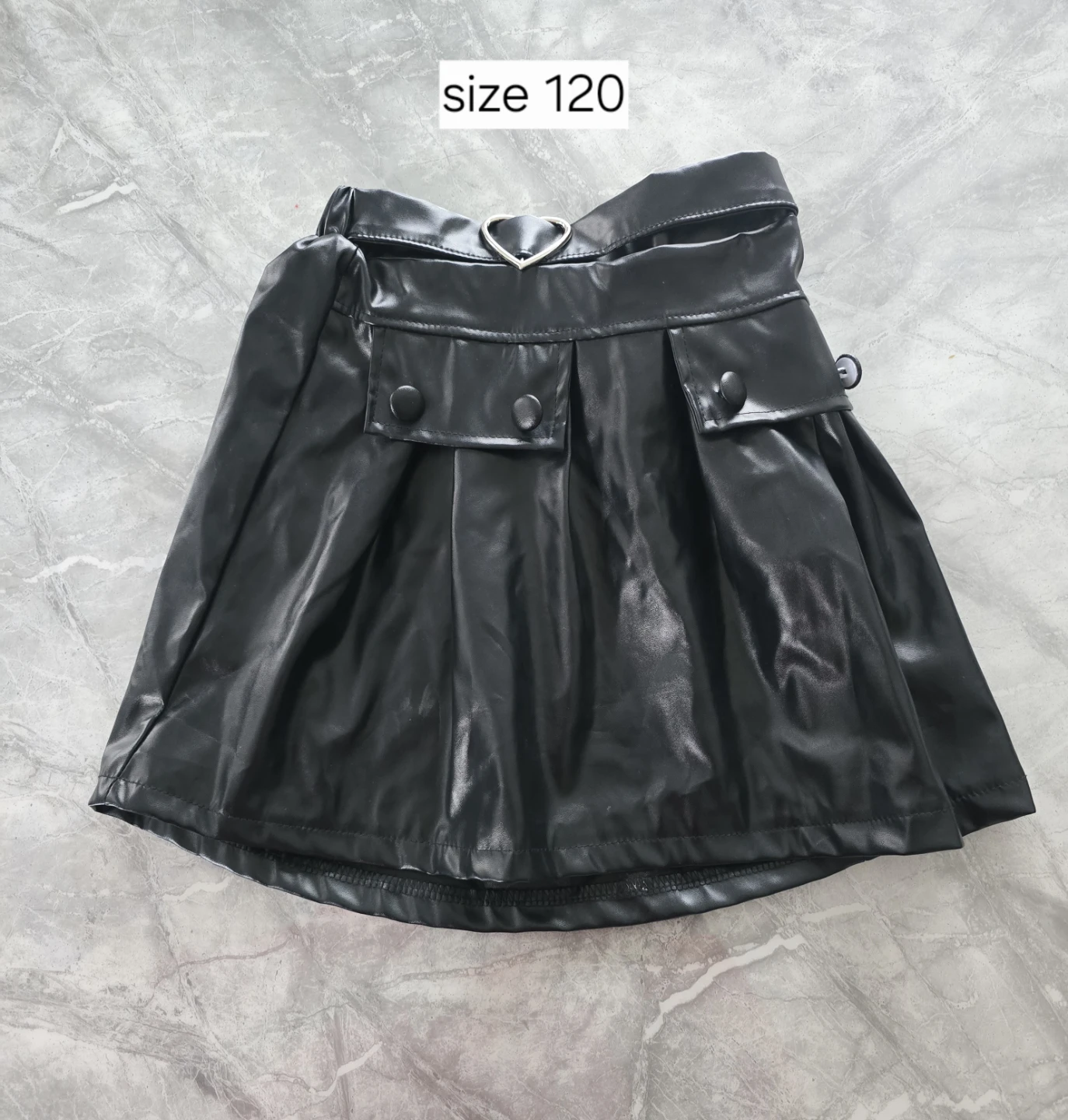 Cute black faux leather skirt for girls. Features a stylish belt with a heart buckle and buttoned pockets. Size 120, suitable for ages 4-5 years. It's made from a shiny faux leather material.