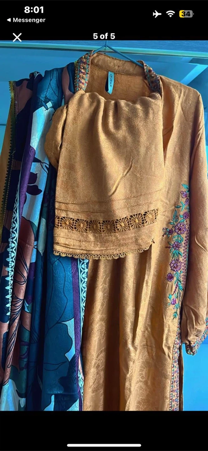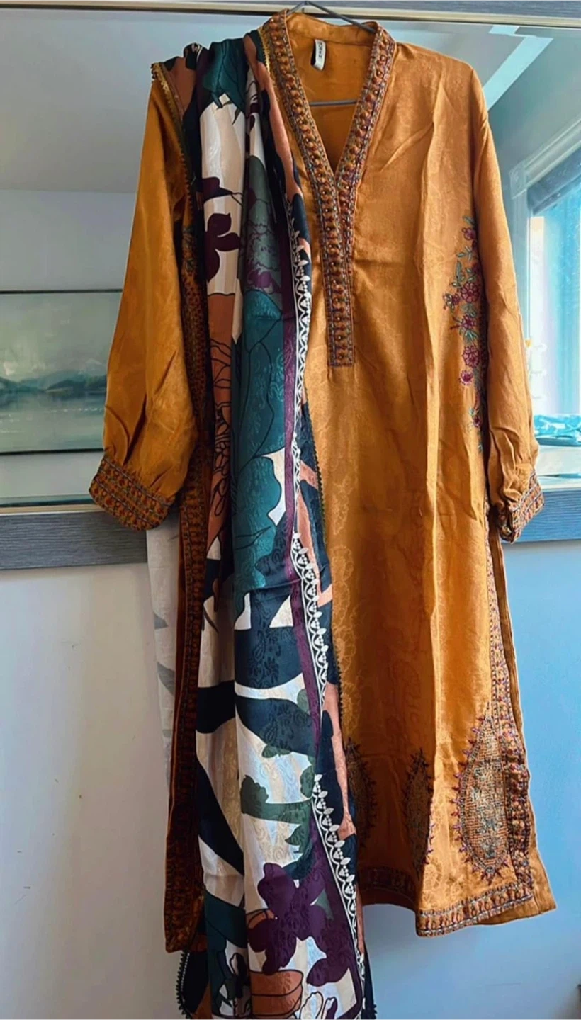 A stylish women's kurti and matching scarf set. The kurti is a rich orange colour with intricate embroidered details and embellishments on the neckline, sleeves, and hem. It includes a complementary scarf featuring a vibrant floral print. Material appears to be a silky blend.