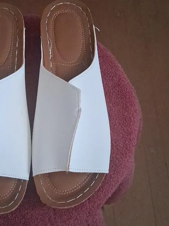 These are white slide sandals. They feature a faux leather upper and a comfortable footbed. Slip-on style for easy wear. Faux leather upper.