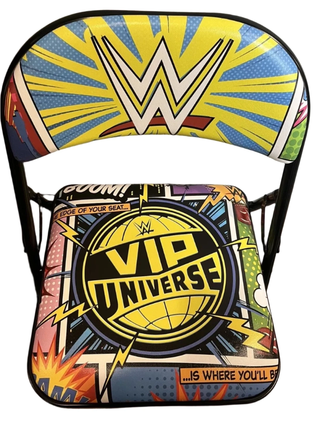 This is a WWE VIP Chair BRAND NEW and still in its packaging!! This is a chair you’d get if you sit ringside with the Ringsider Package for Raw or Smackdown, but this chair is freshly shipped from WWE and never sat on!!
