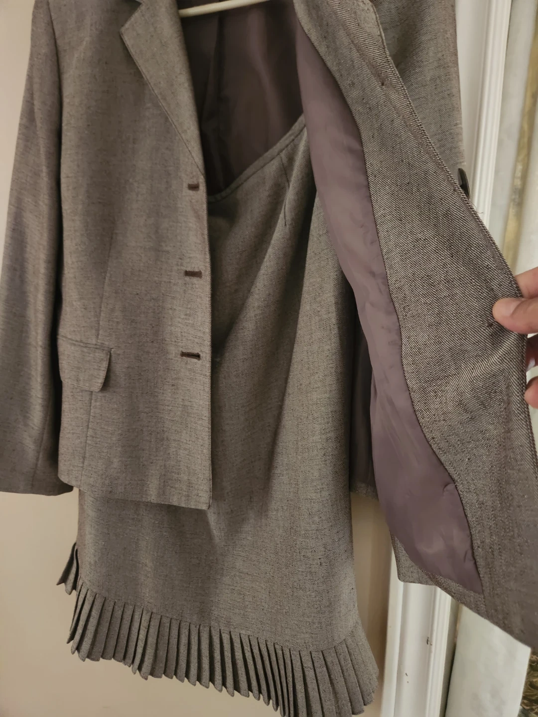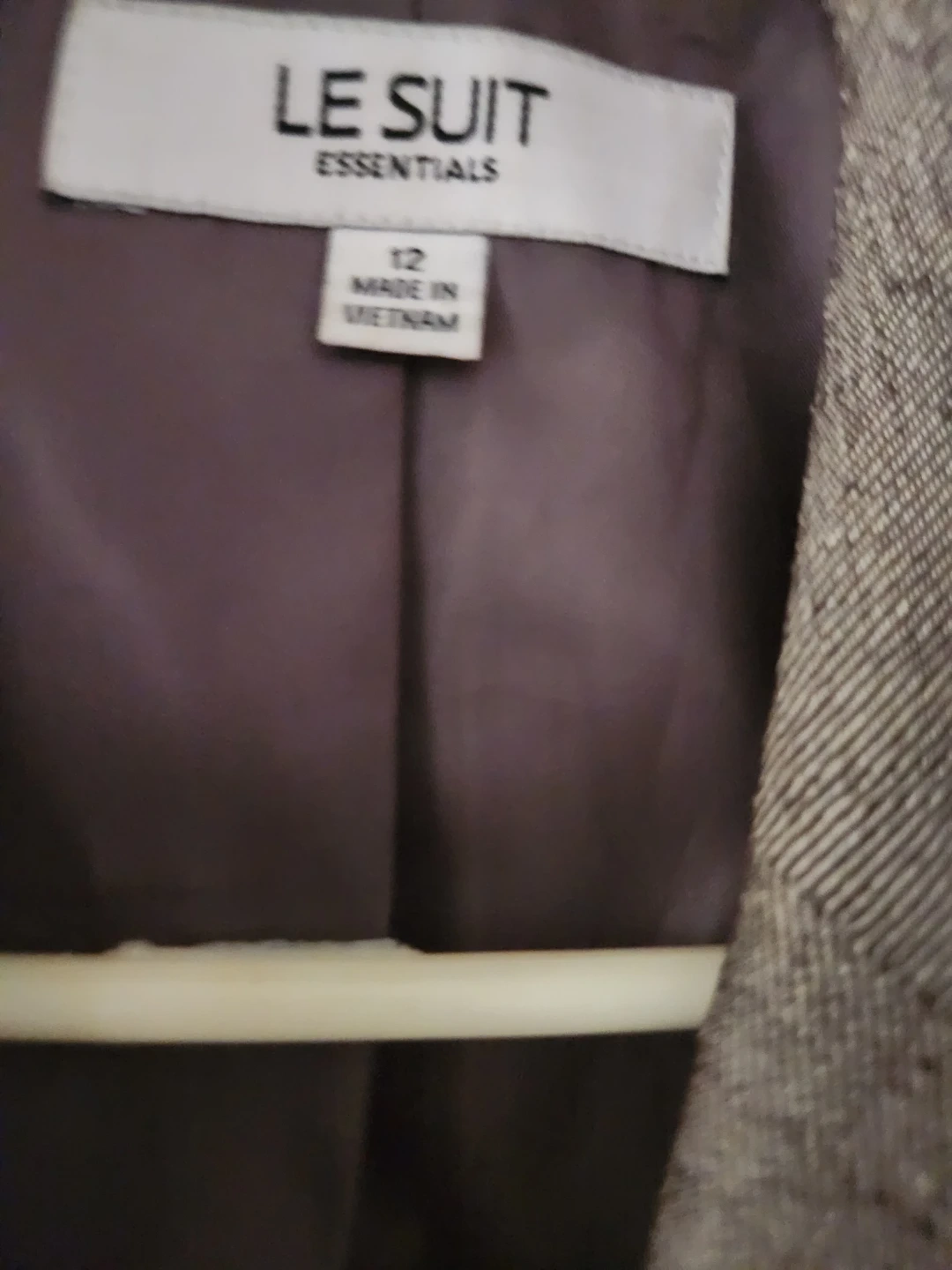 This Le Suit Essentials skirt suit comes in a classic grey tweed-like fabric. It features a blazer with a three-button closure and a pleated skirt. The blazer is lined and includes pockets. Made in Vietnam, size 12. It's a polished choice for professional settings!