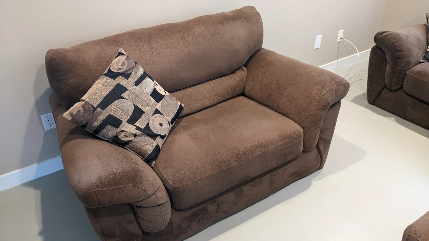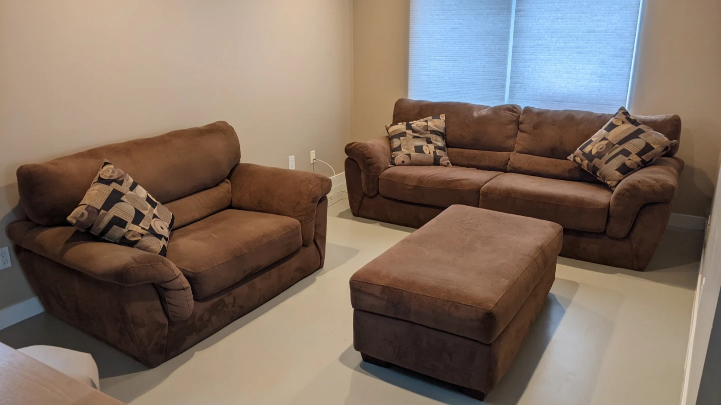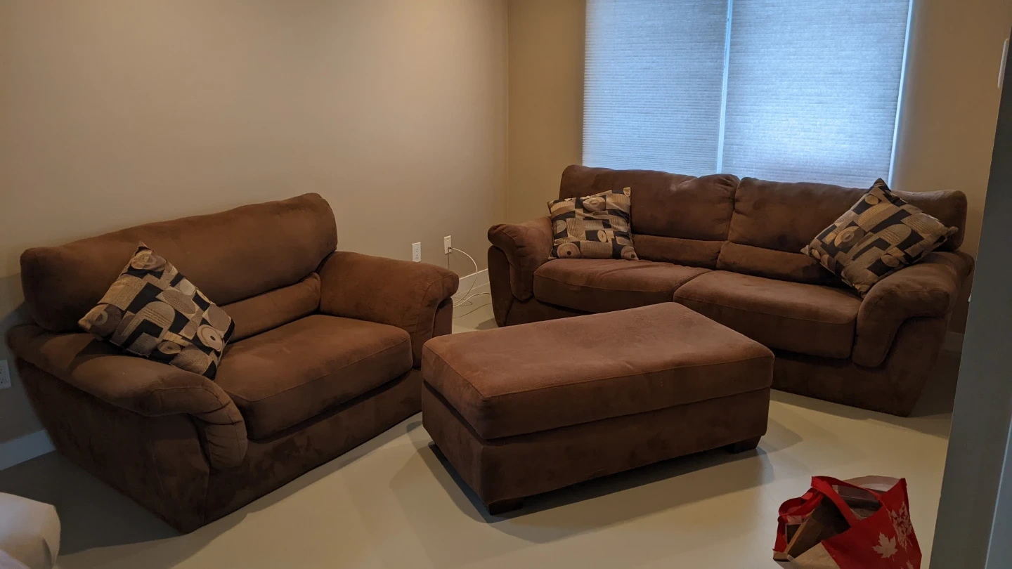 Selling a comfy brown sofa set, including a chair, sofa, and ottoman. It's in good condition and perfect for a living room or family room.