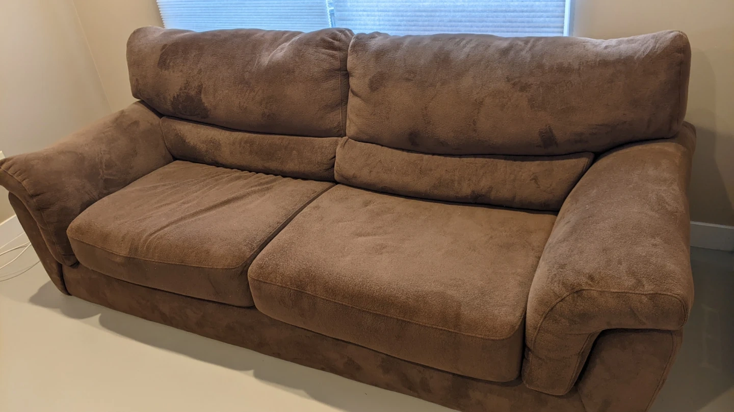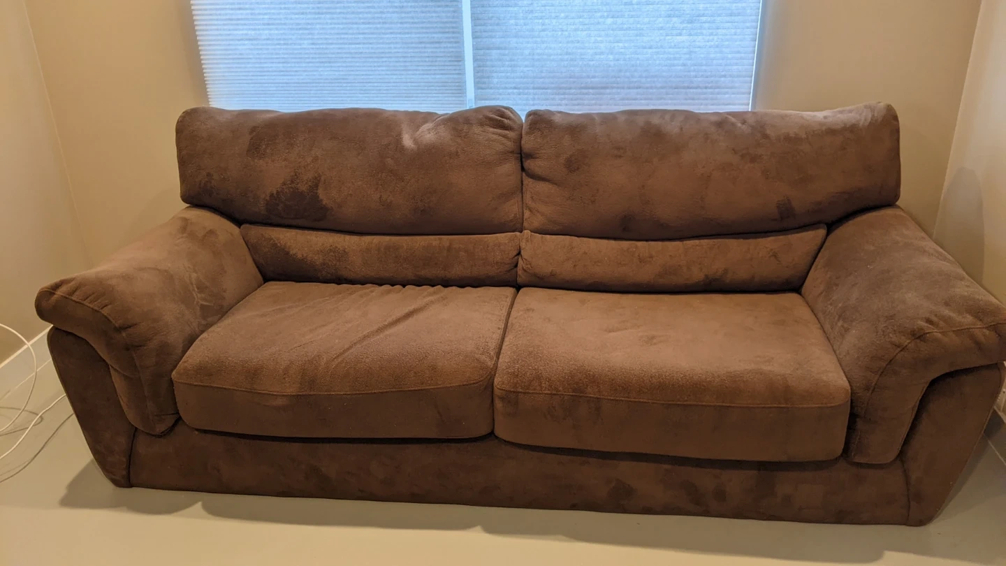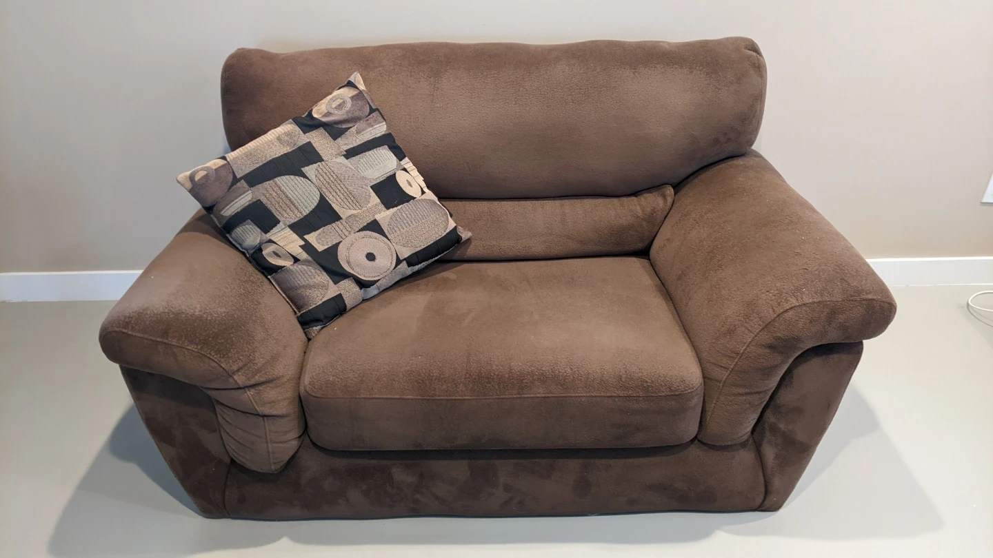 Selling a comfy brown sofa set, including a chair, sofa, and ottoman. It's in good condition and perfect for a living room or family room.