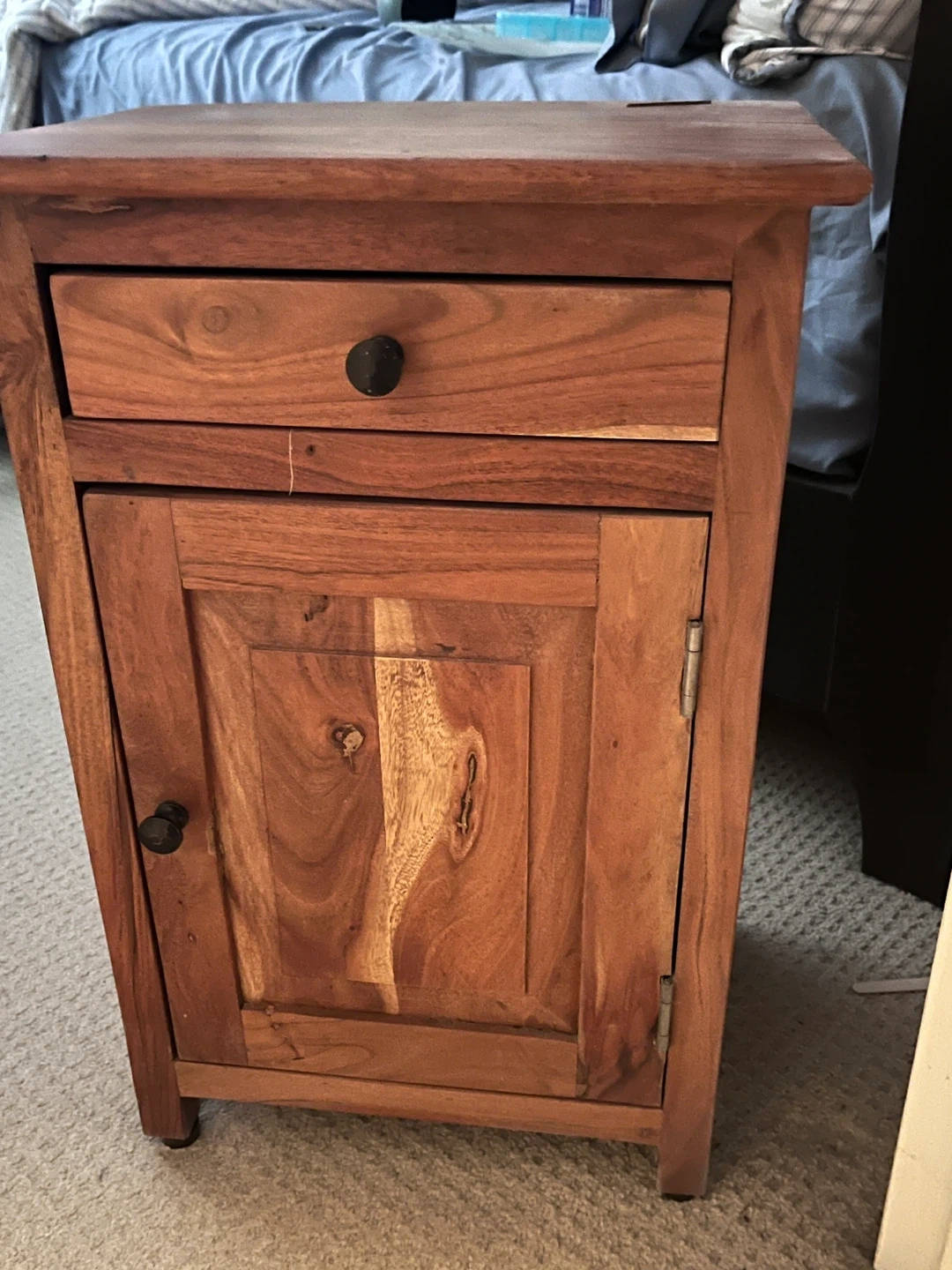 This nightstand is made of solid wood with a warm finish. It features a single drawer at the top and a cabinet below for storage. The cabinet doors open to reveal shelves inside. This piece would work well next to a bed or as a side table.