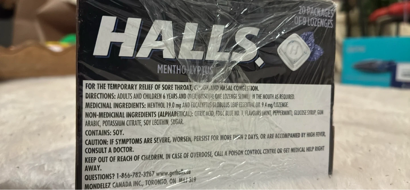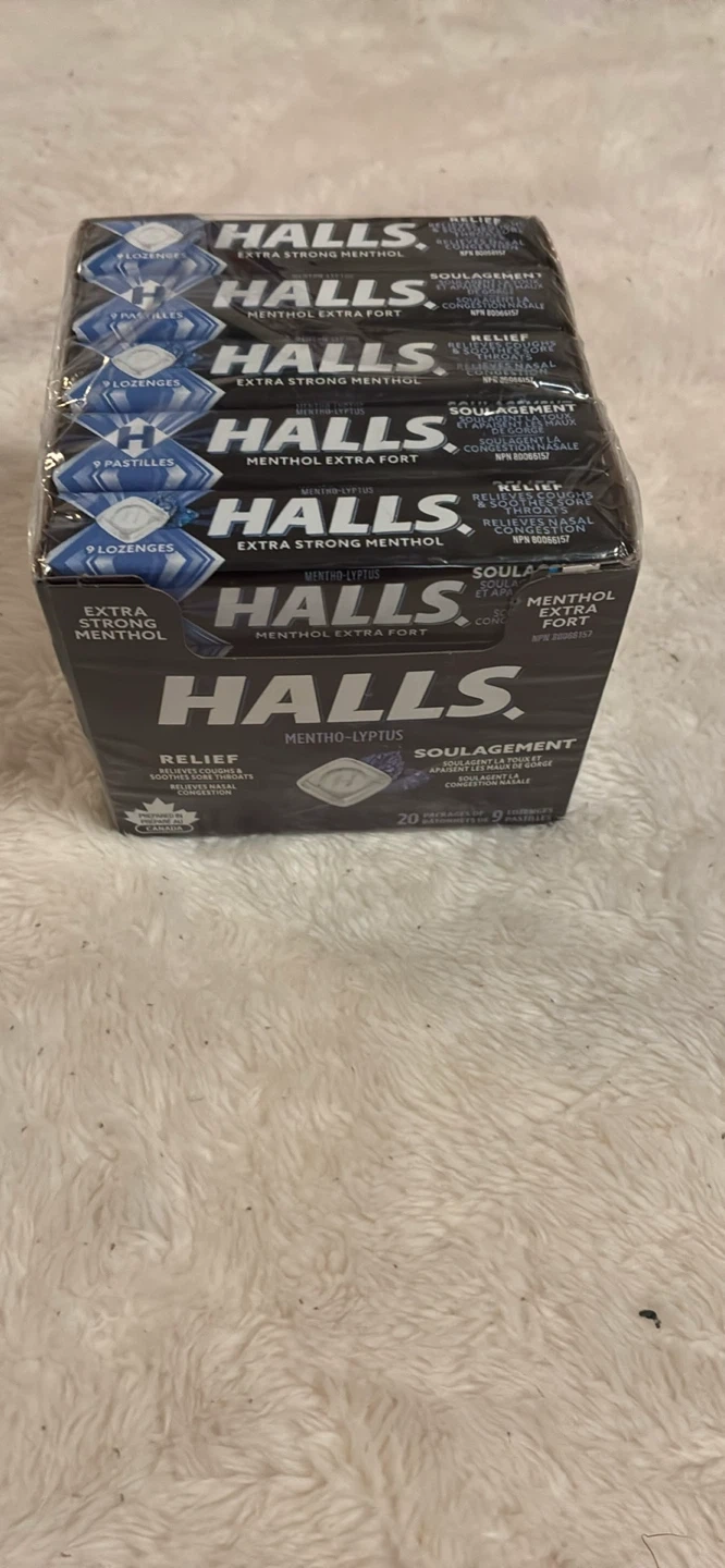 This box contains 20 packages of Halls Mentho-Lyptus cough drops, with 9 lozenges per package. It's for the temporary relief of sore throat, cough, and nasal congestion. Medicinal ingredients include menthol and eucalyptus globulus leaf oil.