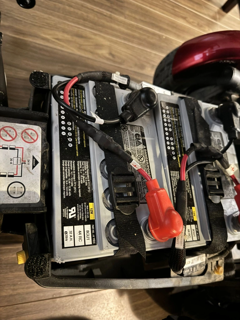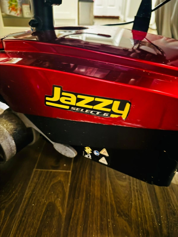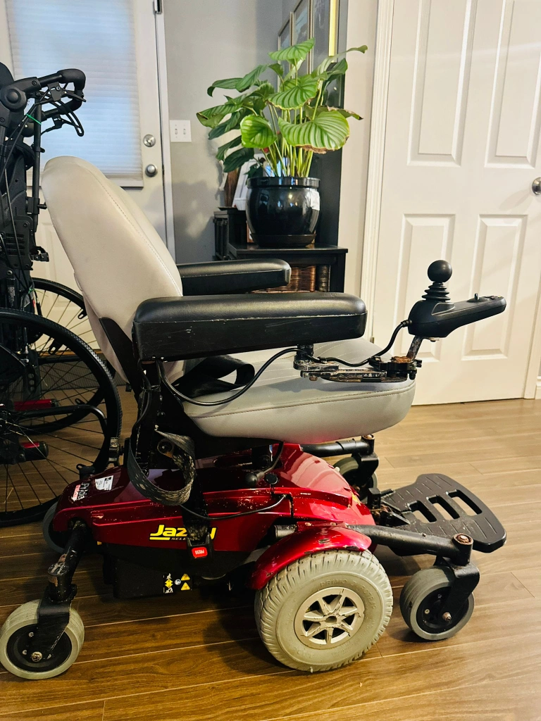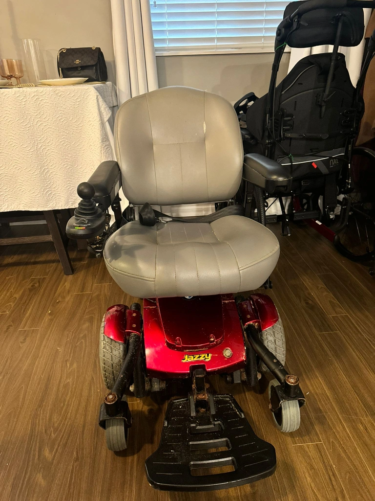 Used Jazzy power wheelchair. Features a grey vinyl seat and armrests. Includes a joystick controller. Shows some wear.