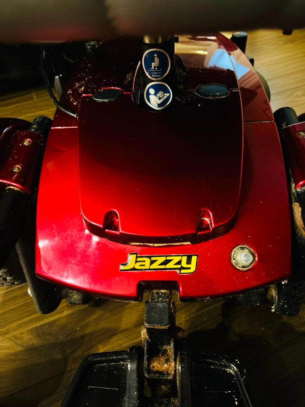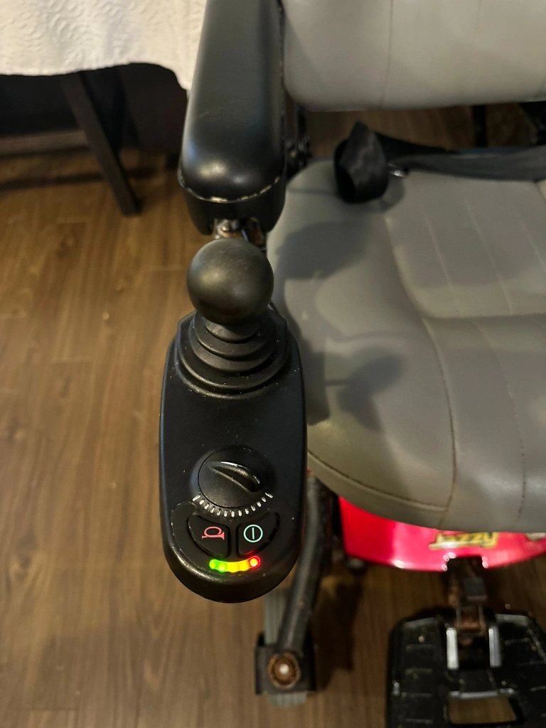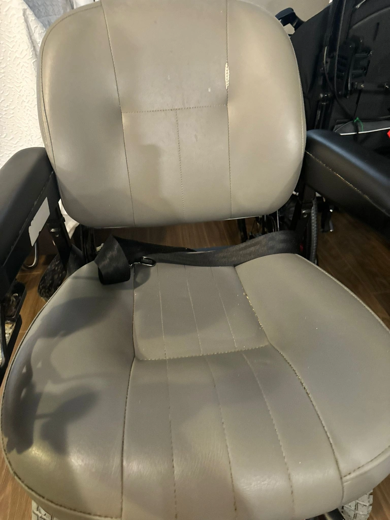 Used Jazzy power wheelchair. Features a grey vinyl seat and armrests. Includes a joystick controller. Shows some wear.