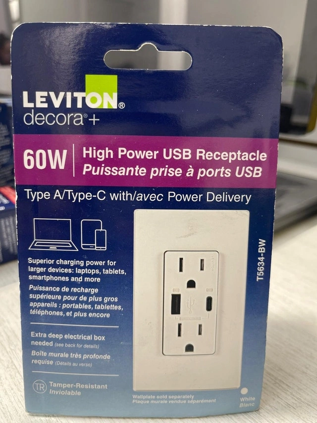 Brand new in box. Leviton's USB Wall Outlet with 60W USB-A + USB-C Power Delivery Charger. Offers up to 50W charging on the USB-C port and 10W on the USB-A port. Power Delivery technology provides up to 2X faster charging for laptops, tablets, phones, and more. Pickup at Islington and Rexdale in Etobicoke. Cash only.