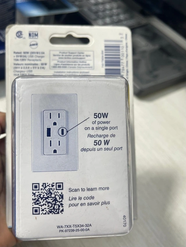 Brand new in box. Leviton's USB Wall Outlet with 60W USB-A + USB-C Power Delivery Charger. Offers up to 50W charging on the USB-C port and 10W on the USB-A port. Power Delivery technology provides up to 2X faster charging for laptops, tablets, phones, and more. Pickup at Islington and Rexdale in Etobicoke. Cash only.
