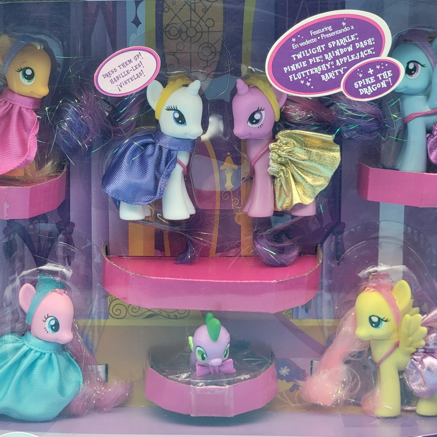 Set includes 6 pony figures, dragon figure, 3 capes, 3 skirts, 6 tiaras and bow tie.