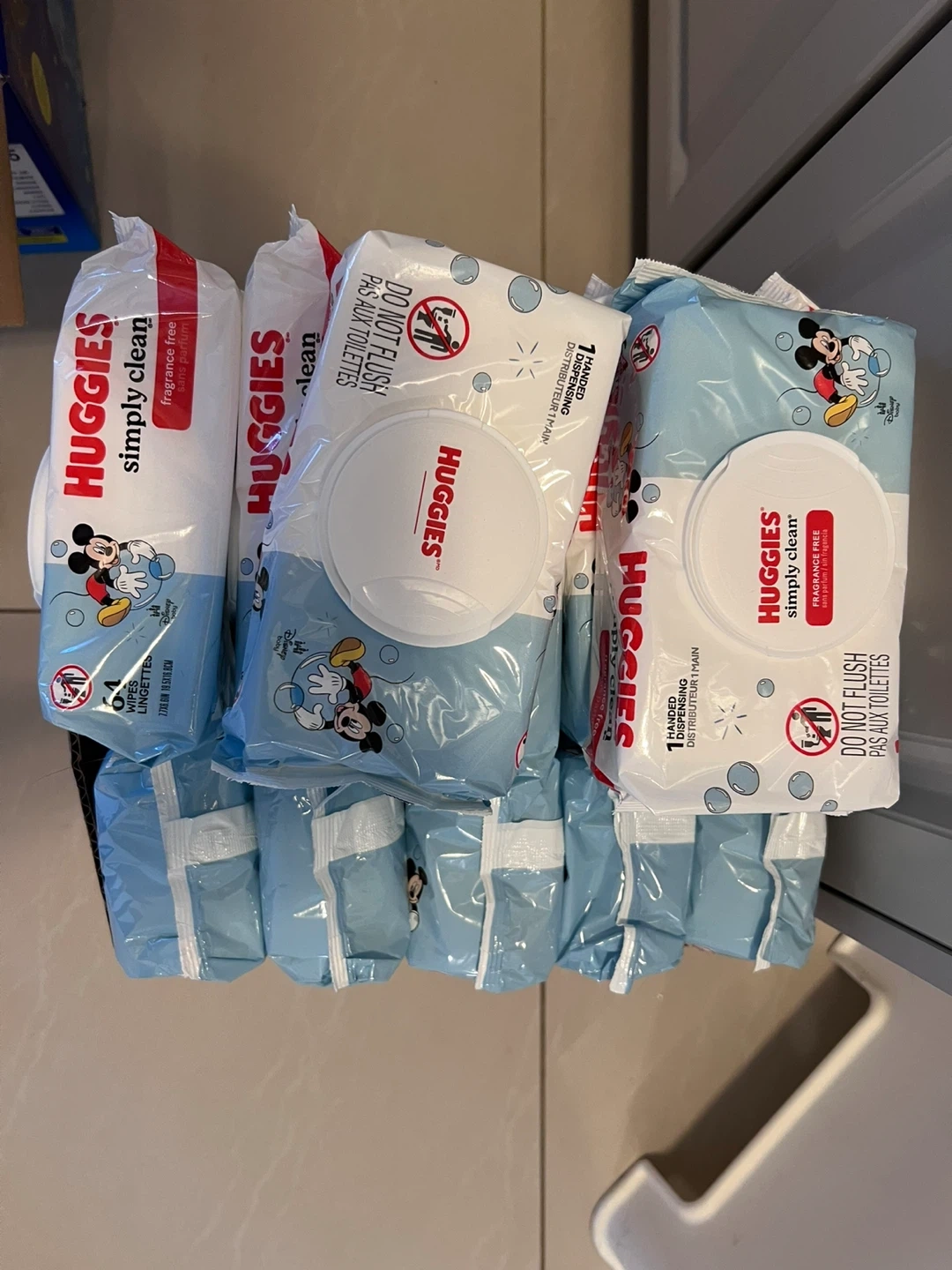This is a multipack of Huggies Simply Clean baby wipes featuring Mickey Mouse. They're fragrance-free and designed for one-handed dispensing. Each wipe measures 7.7 x 6 inches. 32 packs
