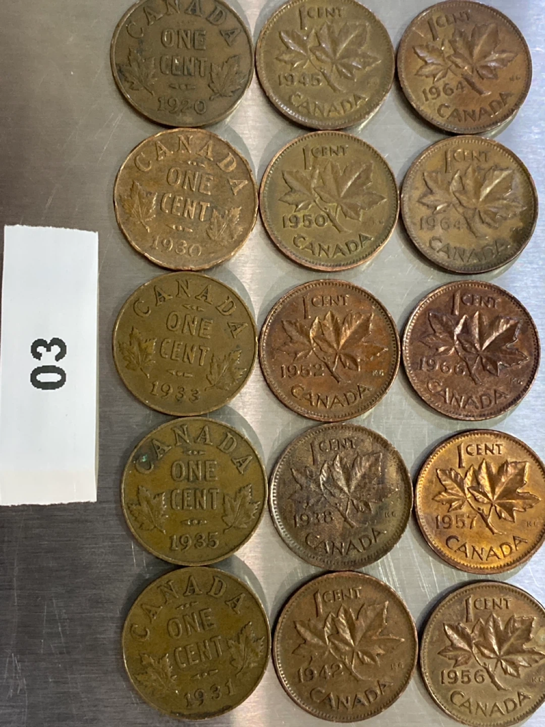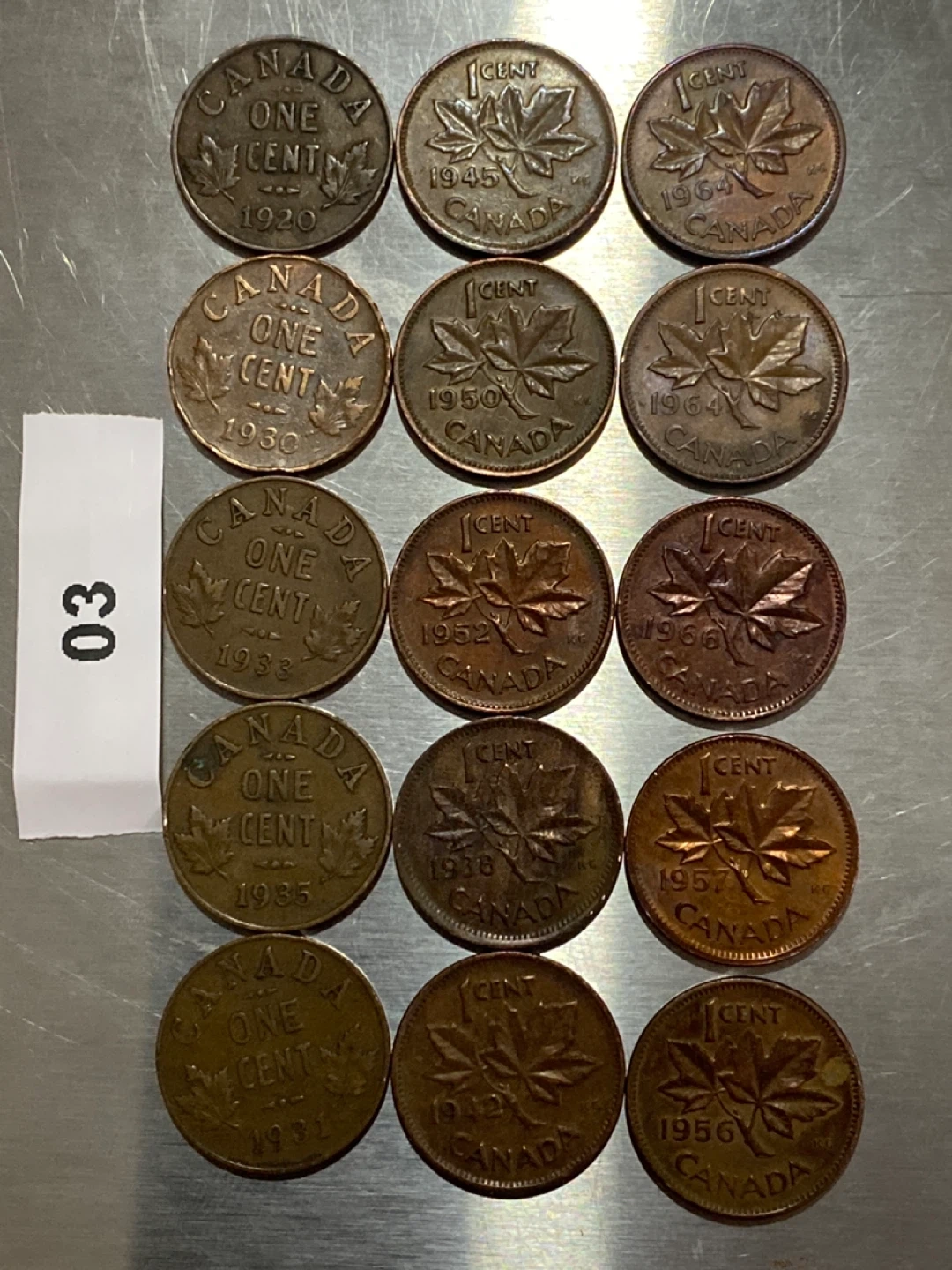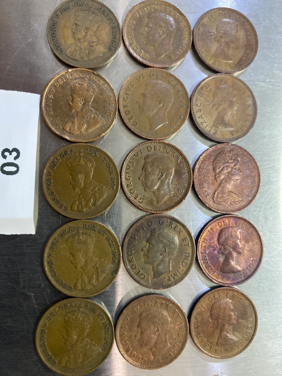 This is a lot of assorted Canadian one cent coins, featuring various monarchs and dates. Some coins show King George VI, others Queen Elizabeth II, and King George V. Dates range from the early 1930s to the mid-1960s. They're made of bronze and copper-nickel.
